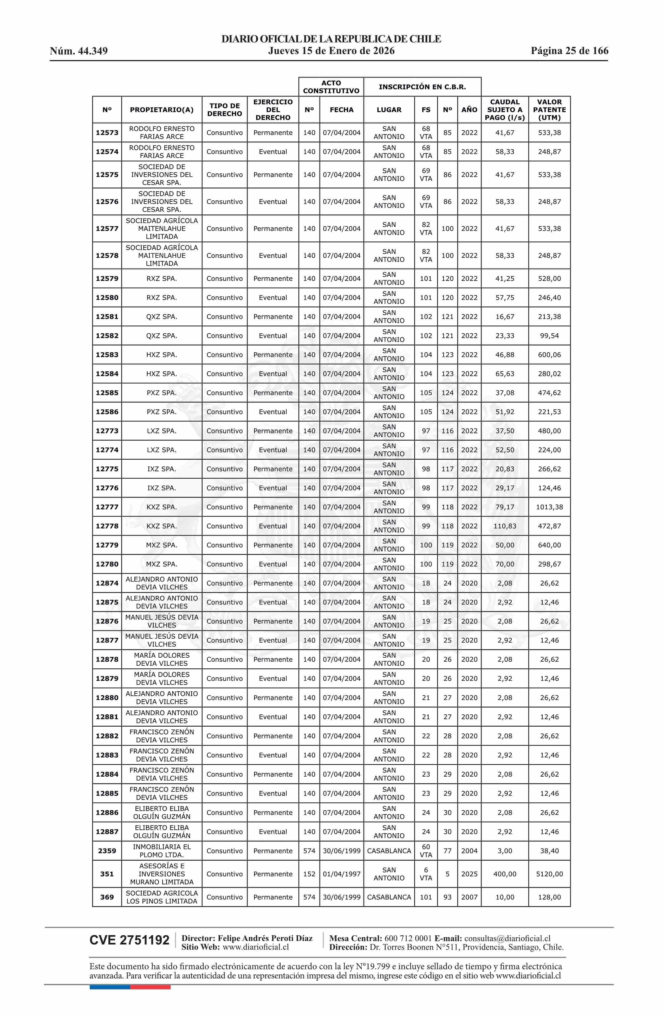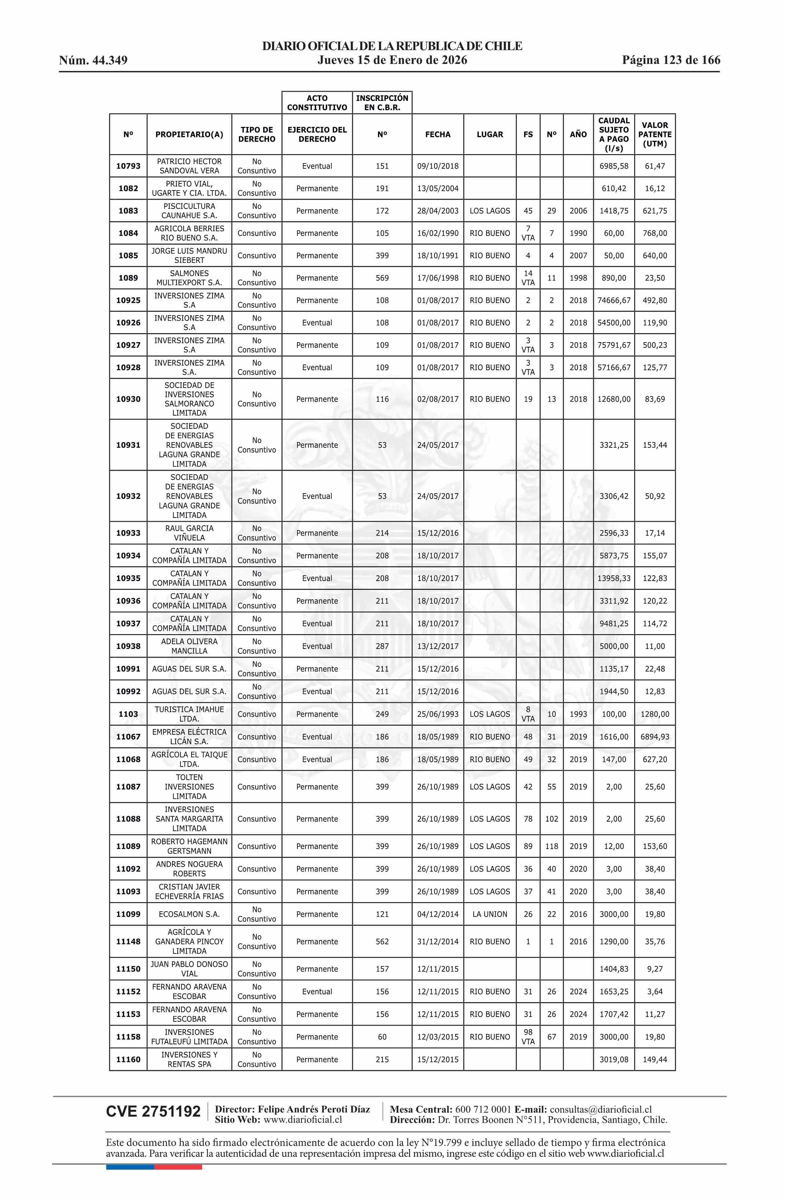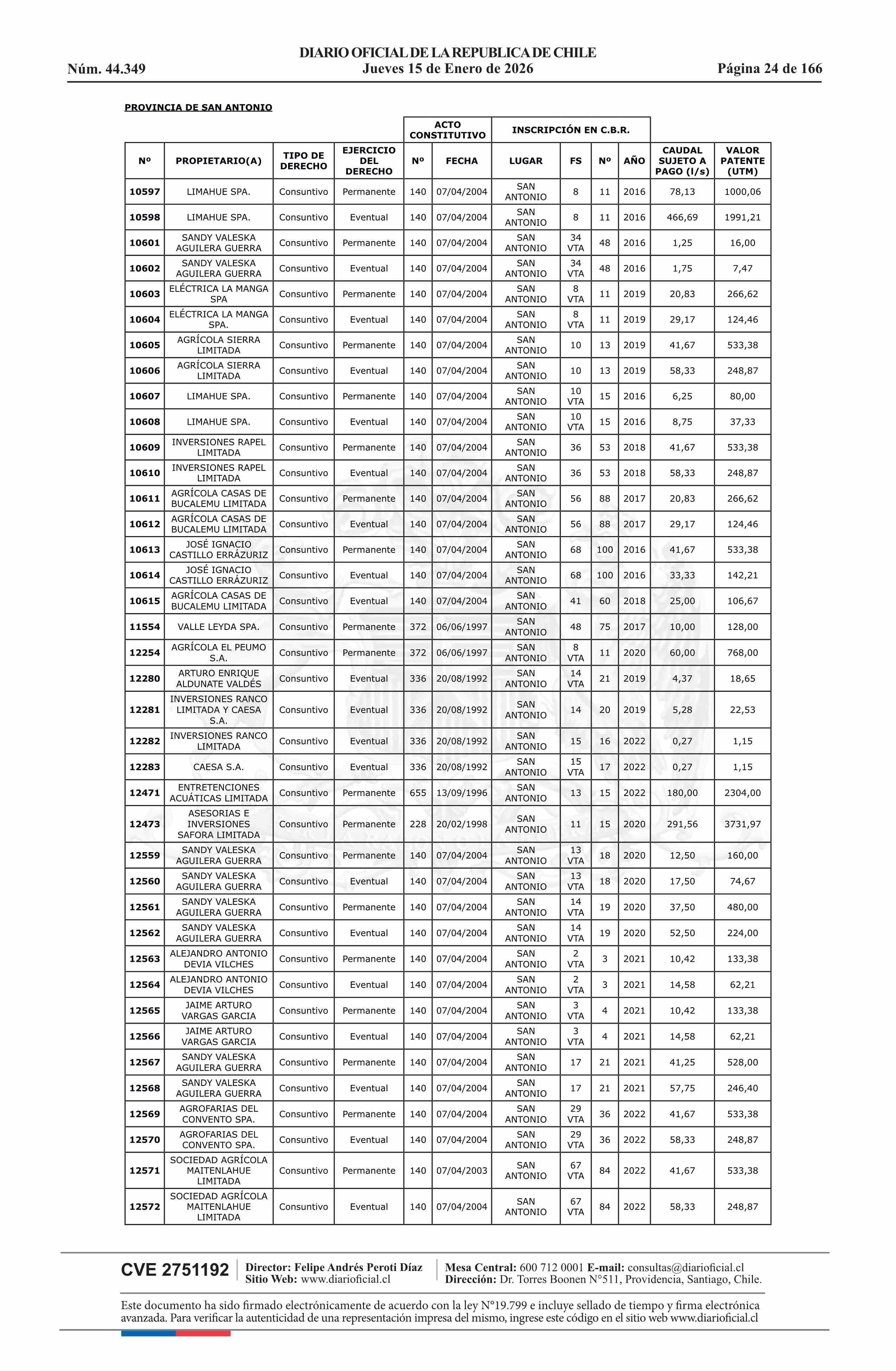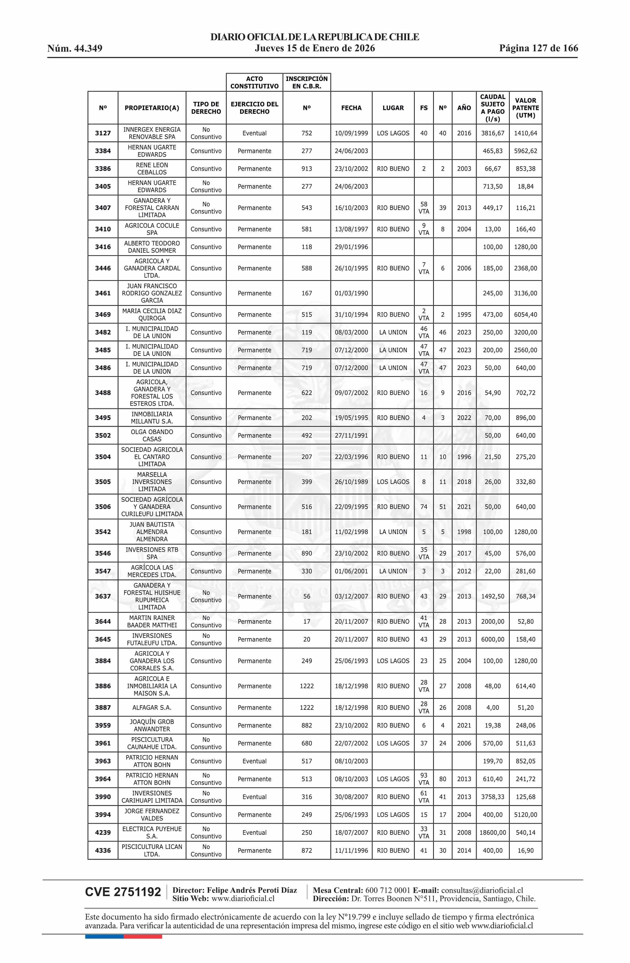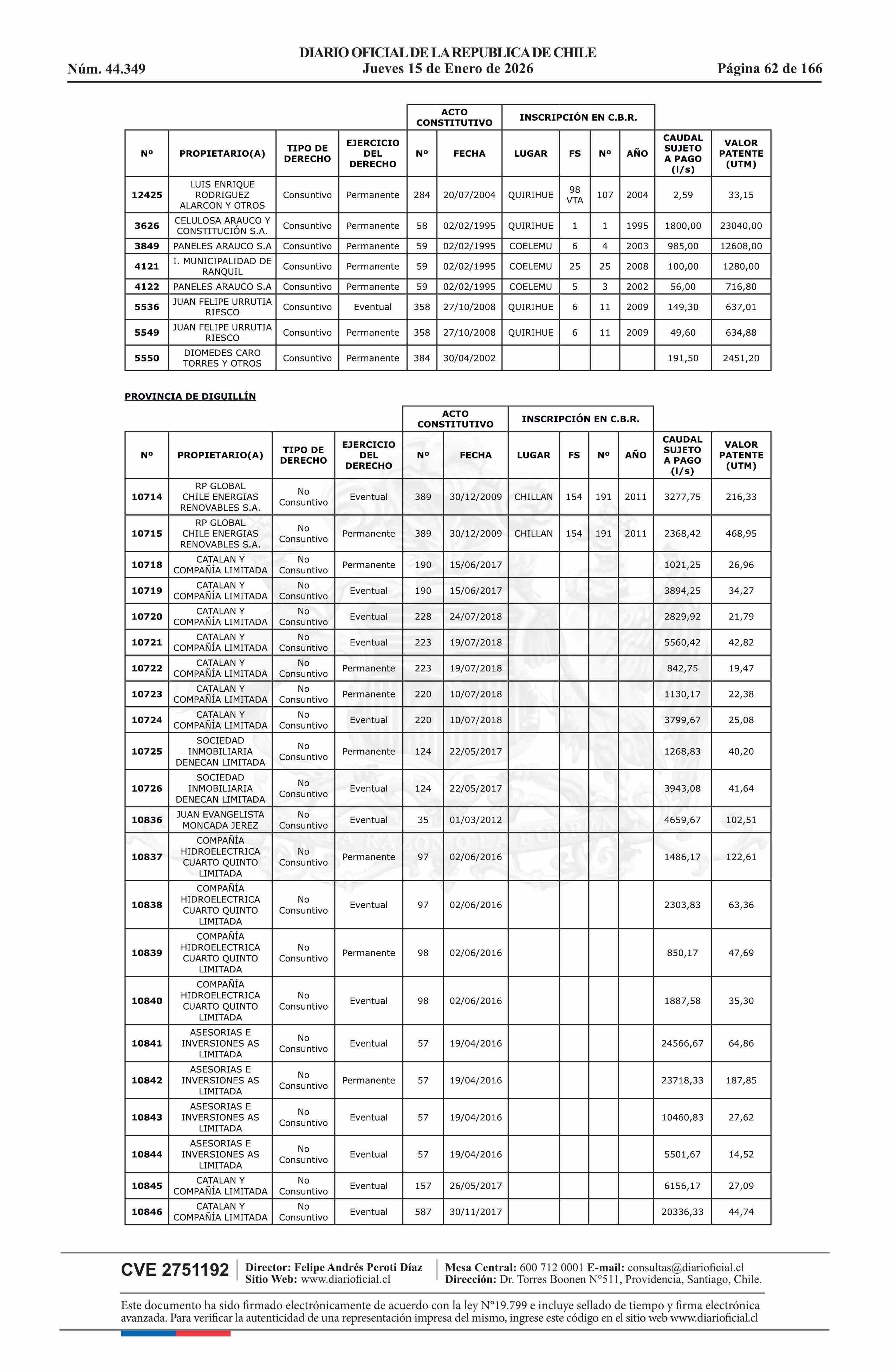 | Título: | Resolución exenta número 5.357, de 2025.- Fija listado de derechos de aprovechamiento de aguas afectos al pago de patente a beneficio fiscal por no utilización de las aguas, proceso 2026 |
