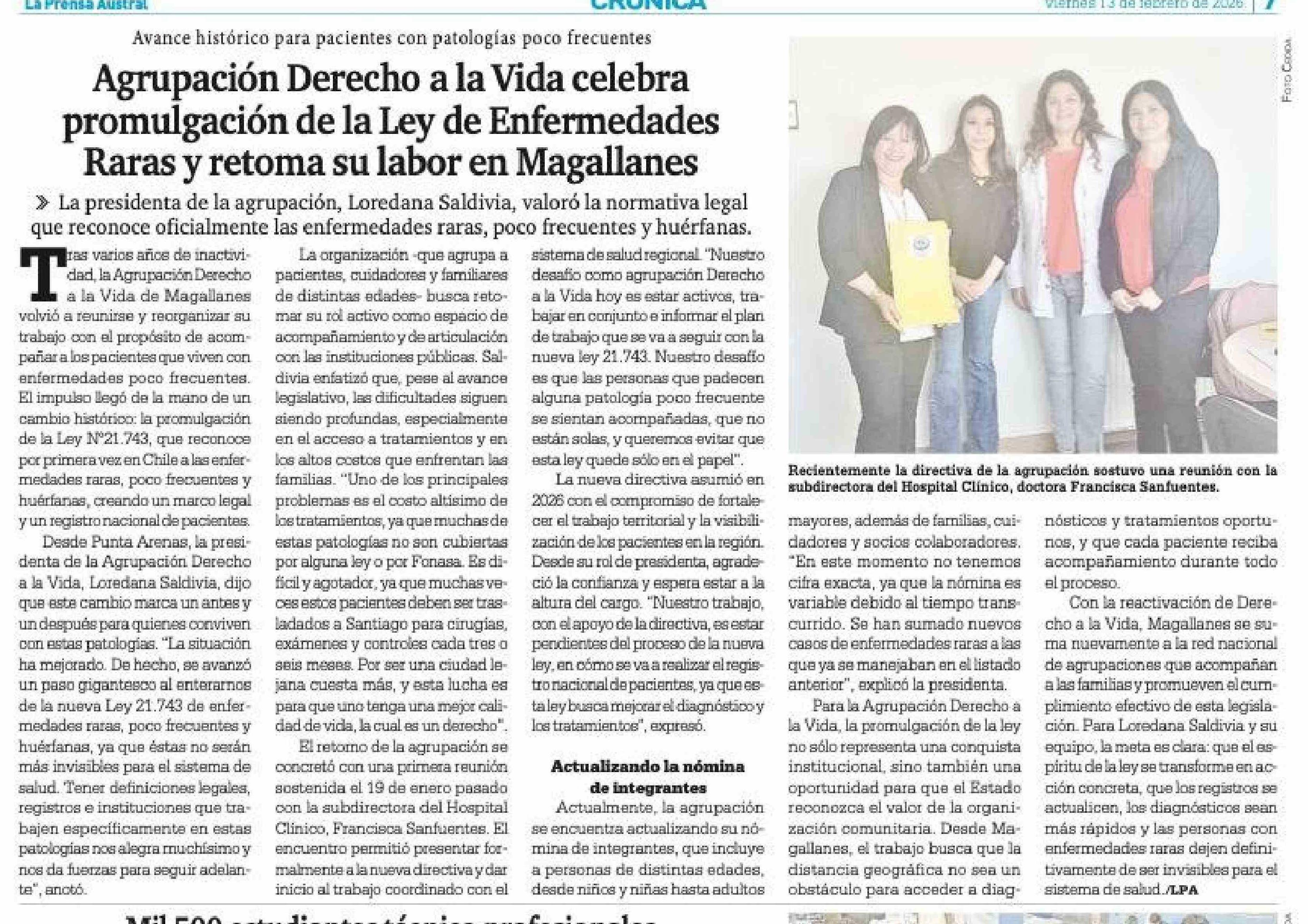 | Título: | Promulgación de la Ley de Enfermedades Raras y retoma su labor en Magallanes > La presidenta de la agrupación, Loredana Saldivia, valoró la normativa legal que reconoce oficialmente las enfermedades raras, poco frecuentes y huérfanas. La organización -que agrupa a sistema de salud regional. "Nuestro |