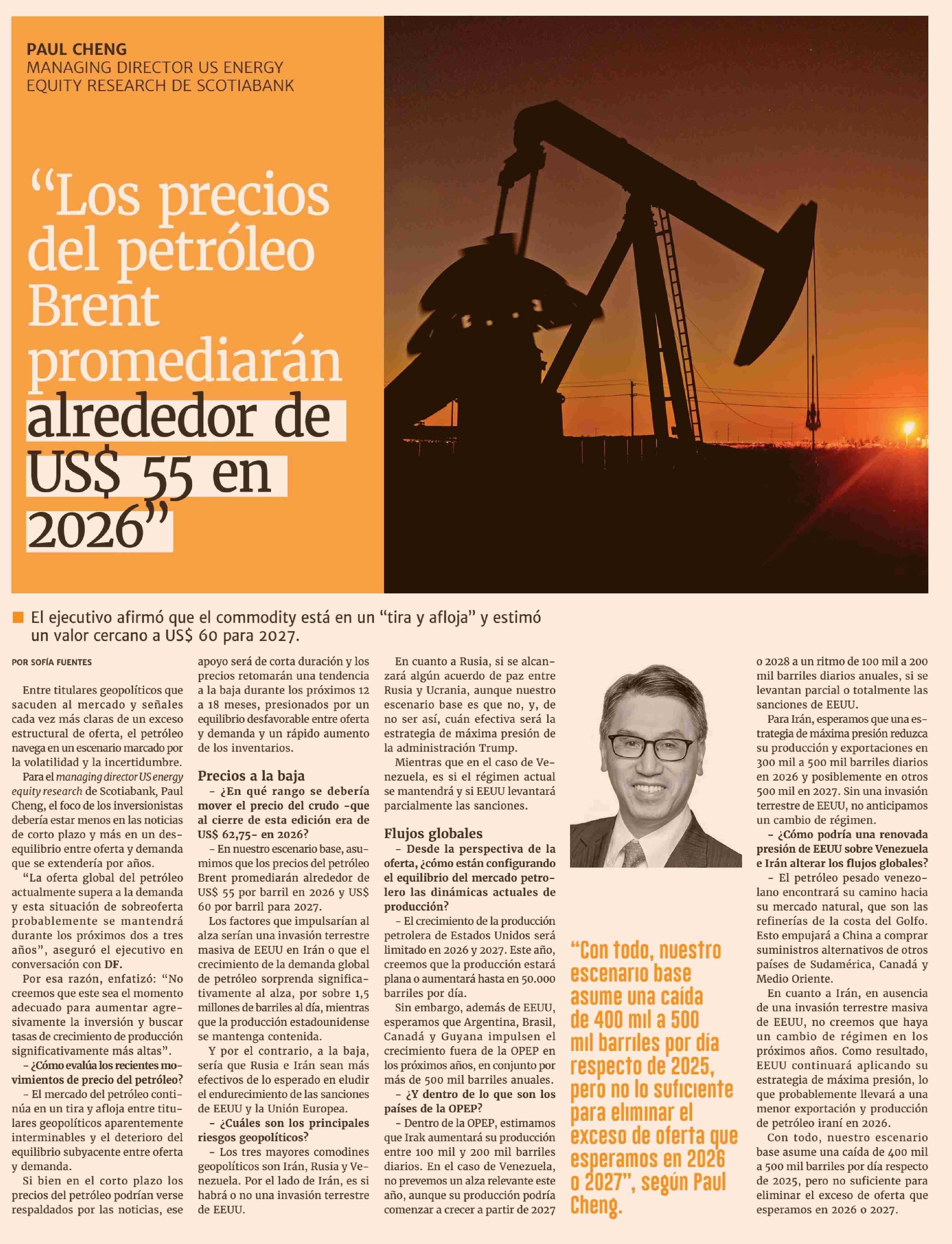 "Los precios del petróleo Brent promediarán alrededor de US$ 55 en 2026'