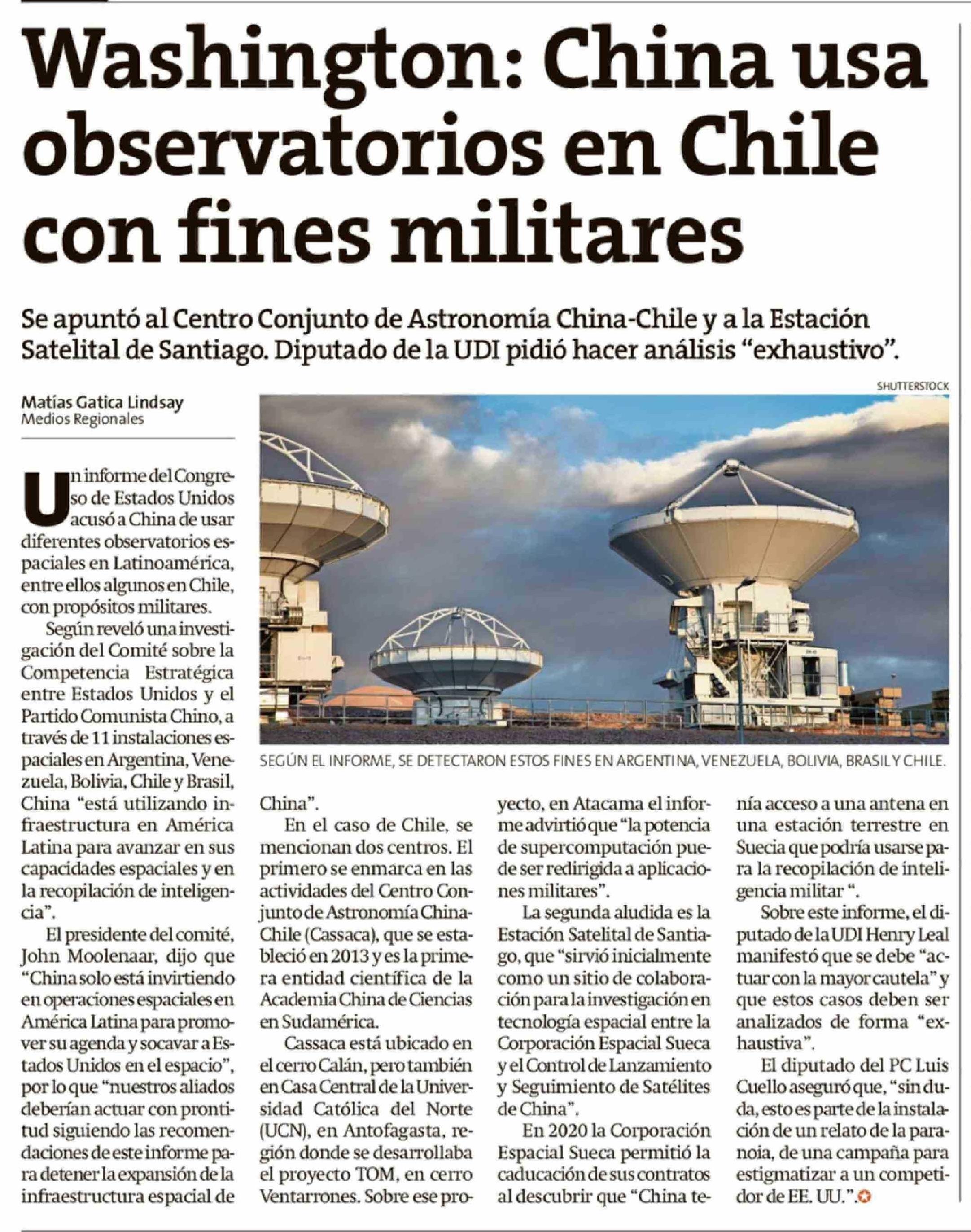 Washington: China usa observatorios en Chile con fines militares