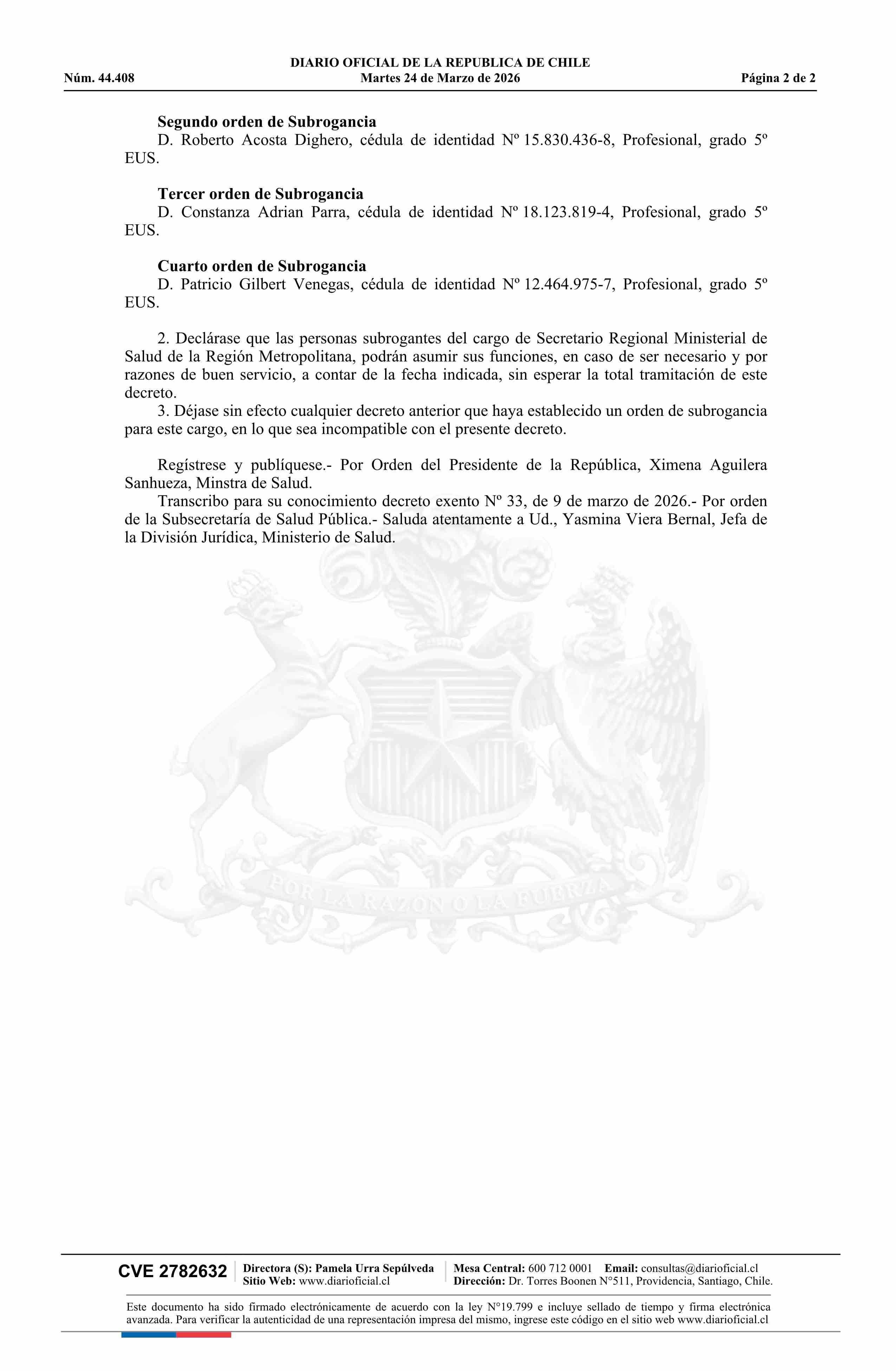 | Título: | Decreto exento número 33, de 2026.- Establece nuevo orden de subrogancia en el cargo de Secretario Regional Ministerial de Salud de la Región Metropolitana |