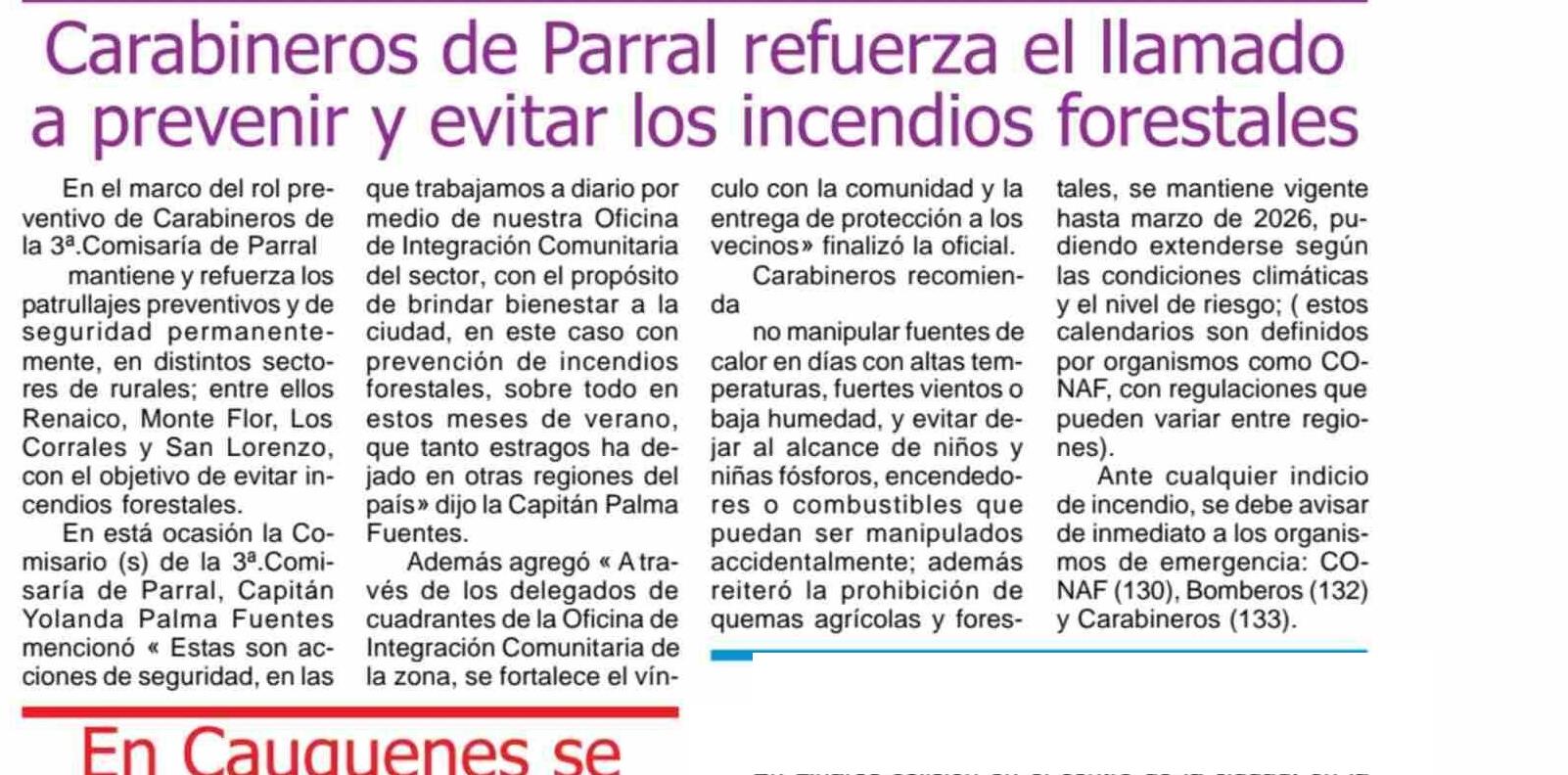 Carabineros de Parral refuerza el llamado y evitar los incendios a prevenir