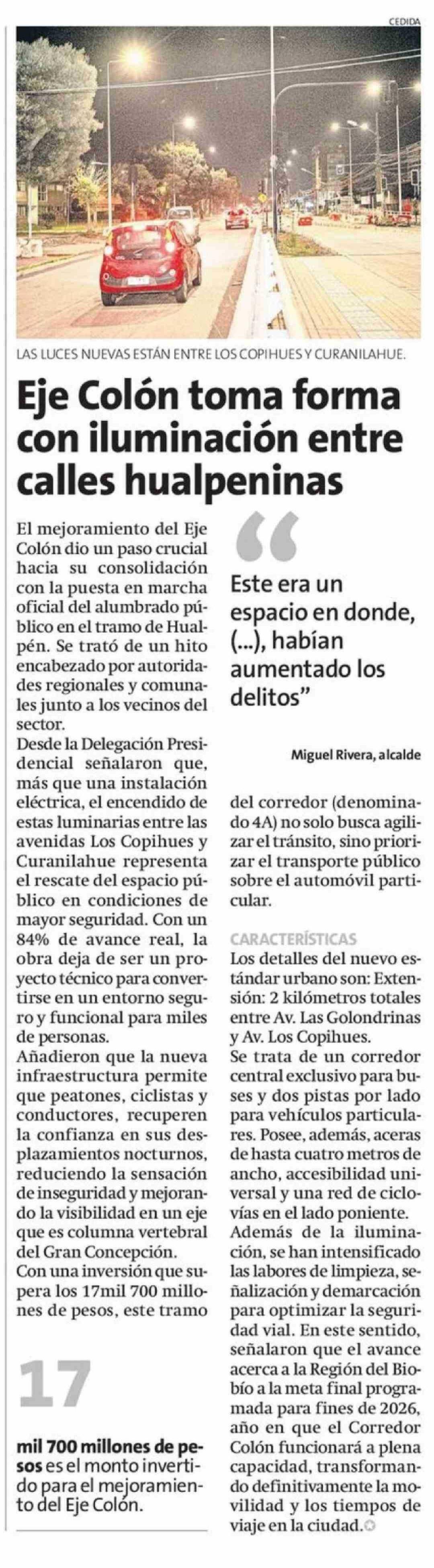 Eje Colón toma forma con iluminación entre calles hualpeninas