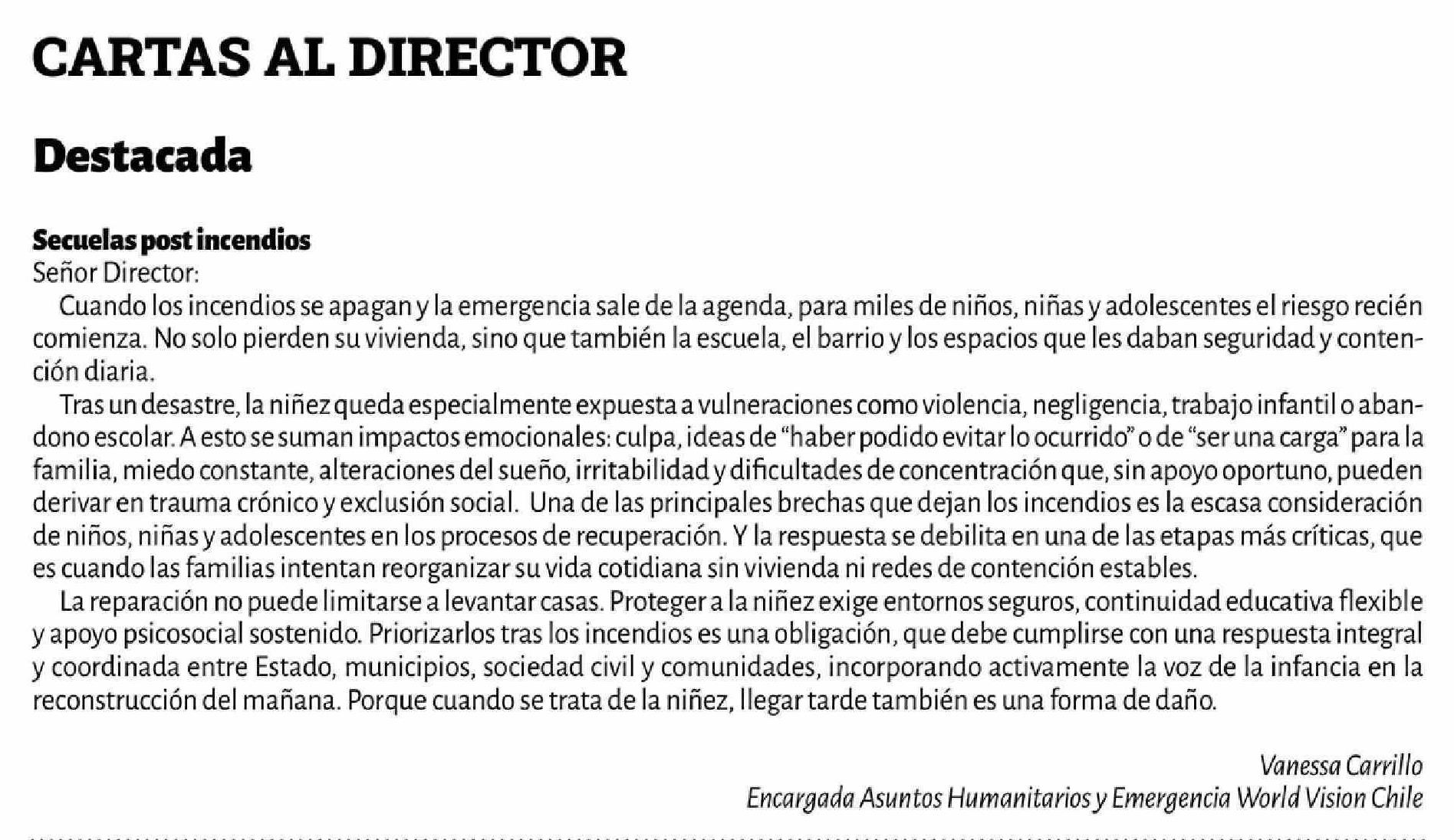 Título: Cartas: Secuelas post incendios Señor Director: Cuando los incendios se apagan y la emergencia sale de la agenda, para miles de niños, niñas y adolescentes el riesgo recién comienza. No solo pierden su vivienda, sino que también la escuela, el barrio y los espacios que les daban seguridad y contenci