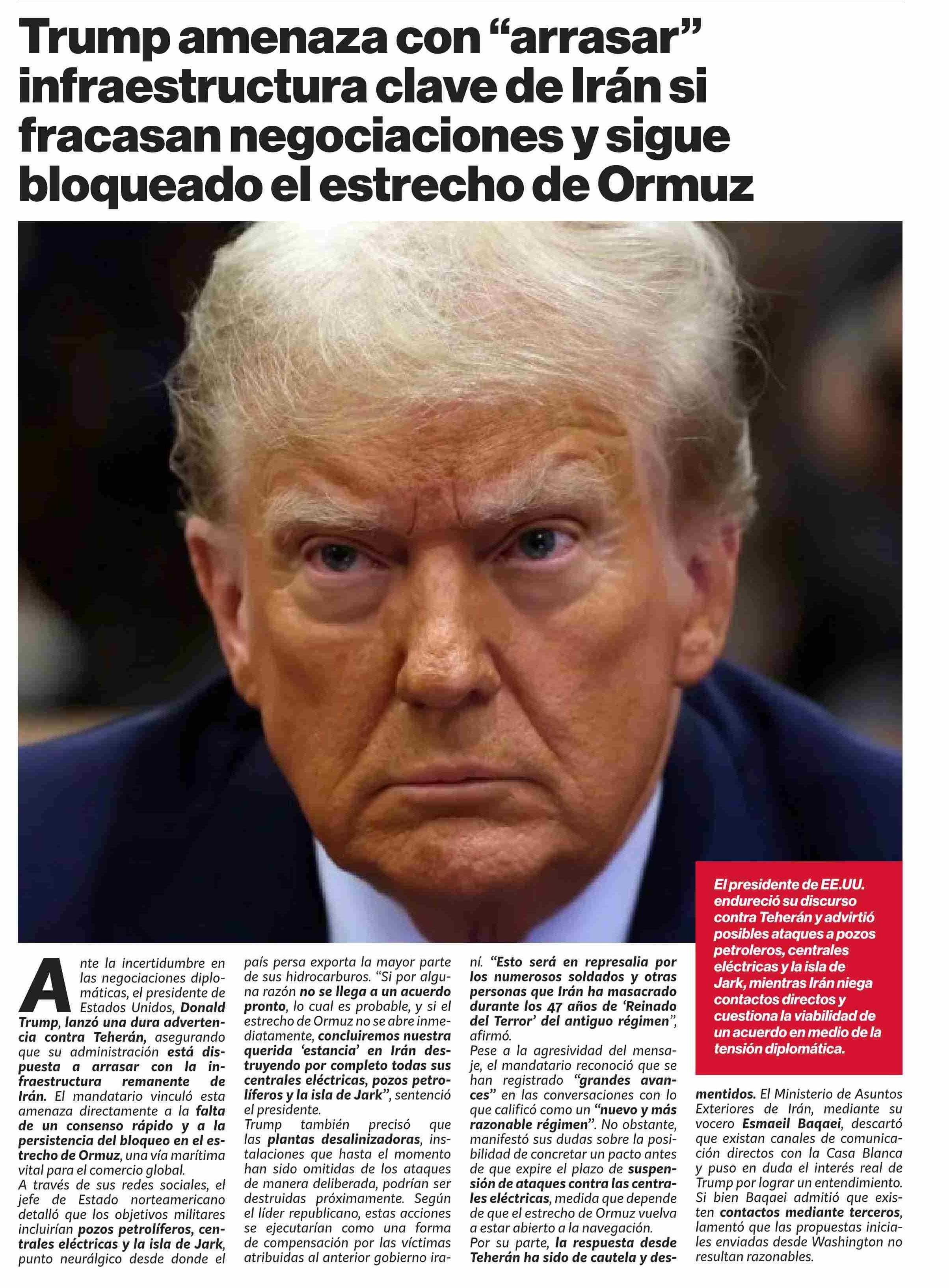 Trump amenaza con “arrasar” infraestructura clave de Irán si fracasan negociaciones y sigue bloqueado el estrecho de Ormuz