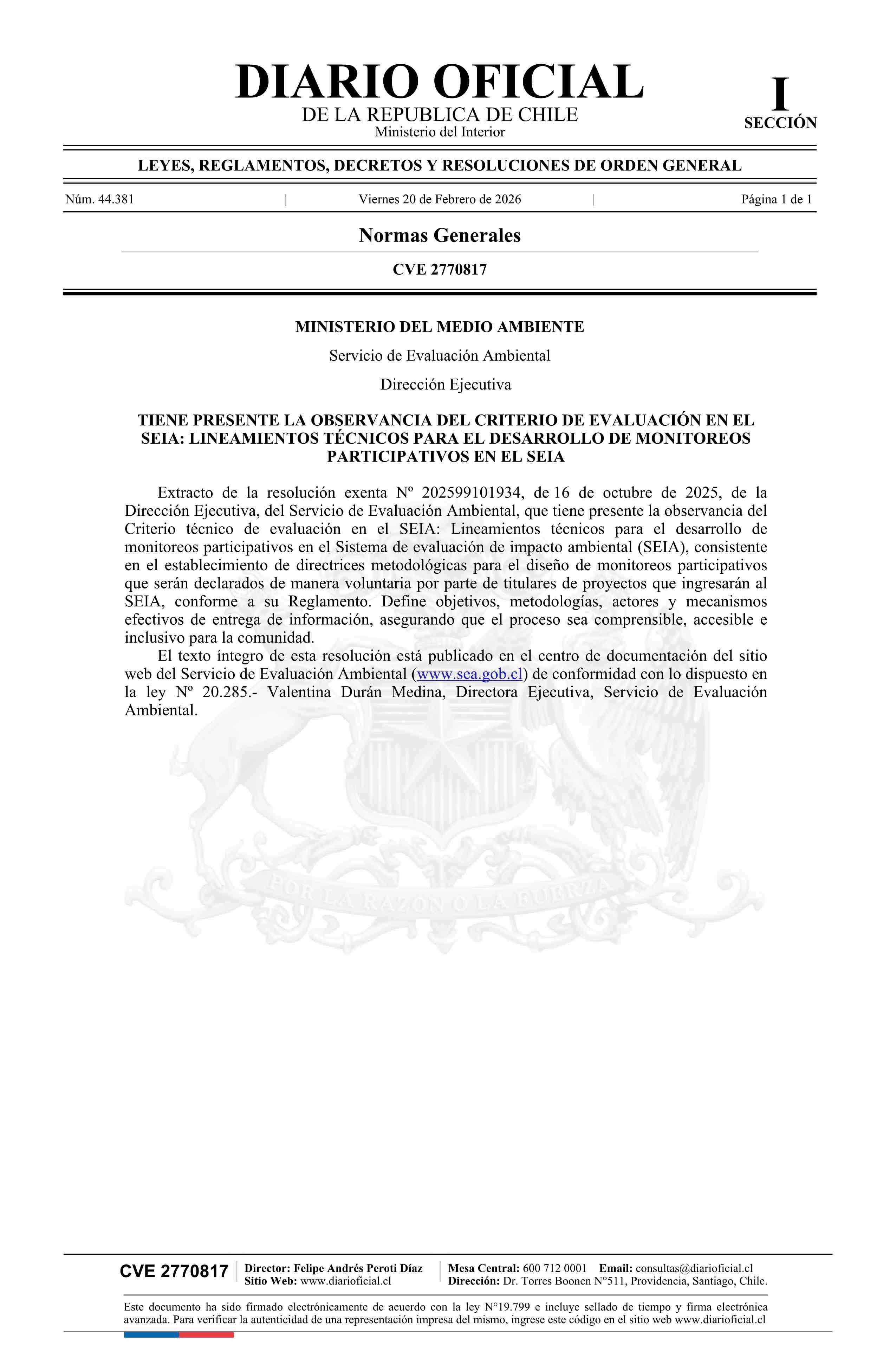 Título: Extracto de resolución exenta número 202599101934, de 2025.- Tiene presente la observancia del criterio de evaluación en el SEIA: Lineamientos técnicos para el desarrollo de monitoreos participativos en el SEIA