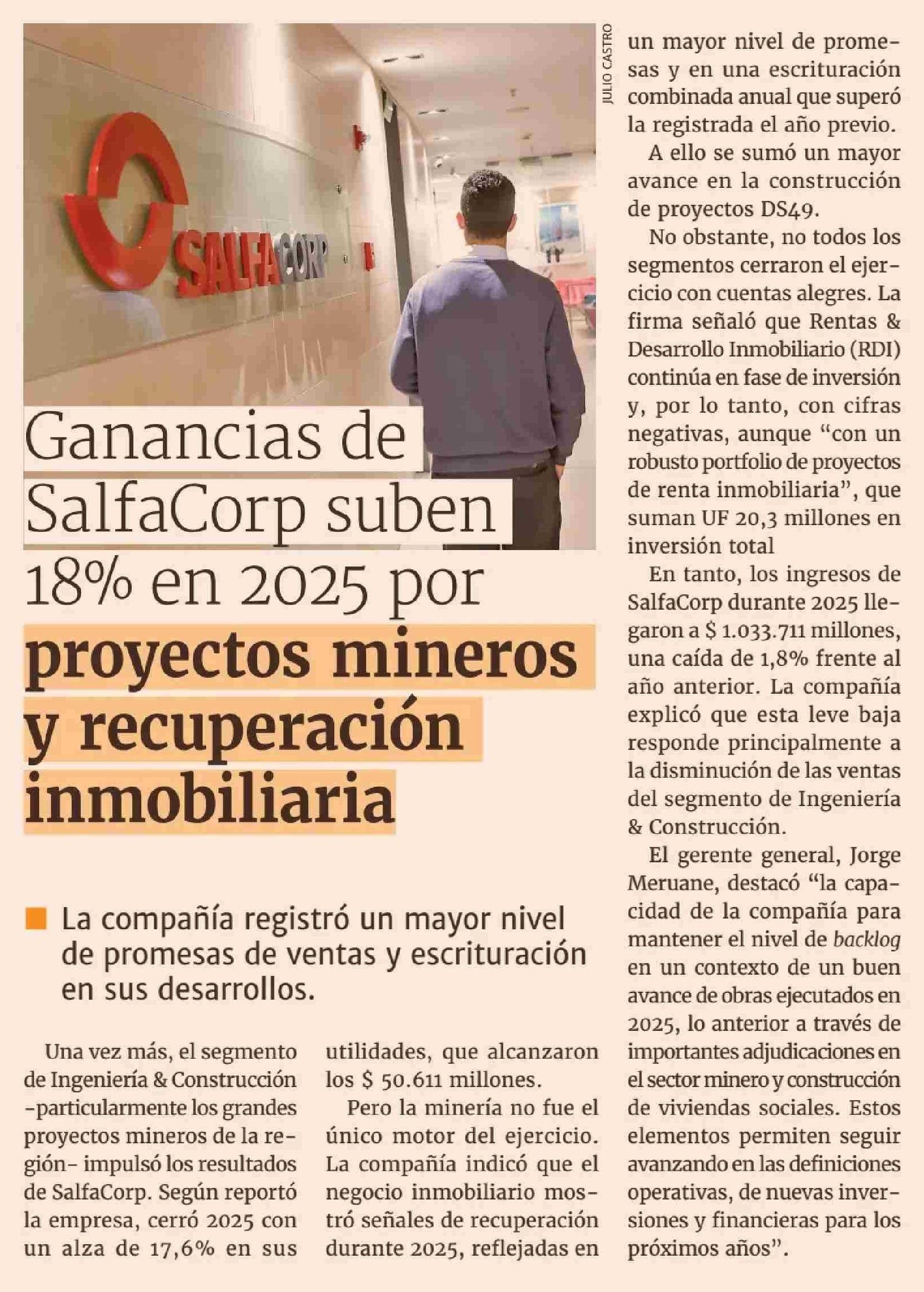 Ganancias de SalfaCorp suben 18% en 2025 por proyectos mineros y recuperación inmobiliaria