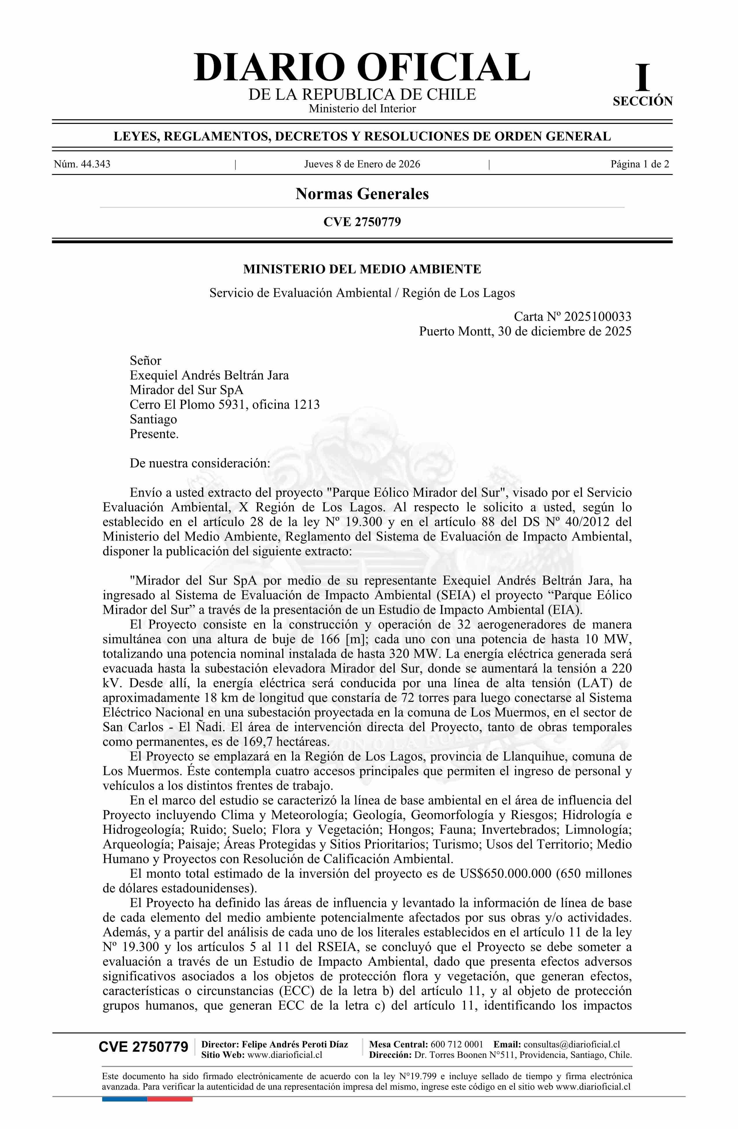 | Título: | Extracto de Estudio de Impacto Ambiental proyecto Parque Eólico Mirador del Sur |
