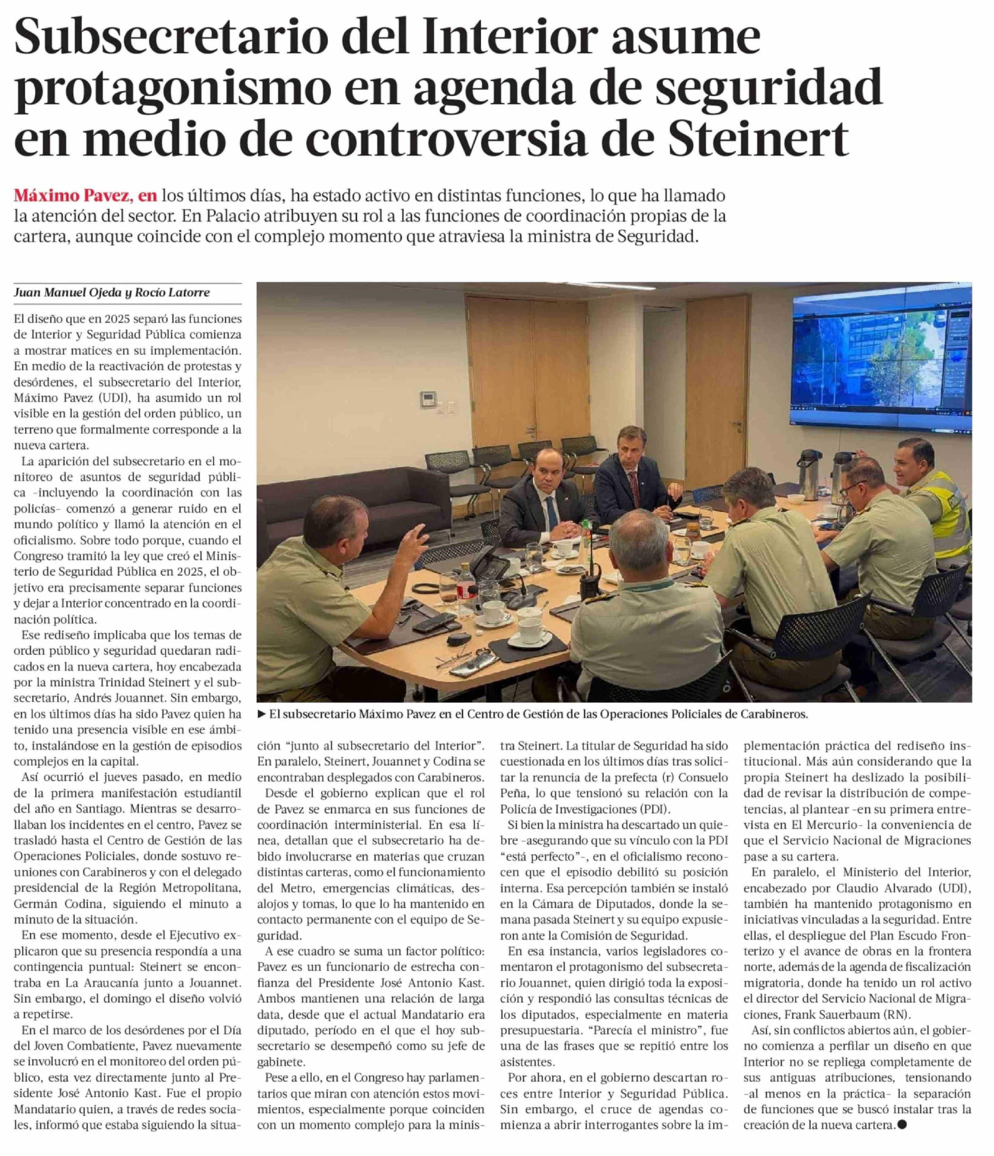 Subsecretario del Interior asume protagonismo en agenda de seguridad en medio de controversia de Steinert