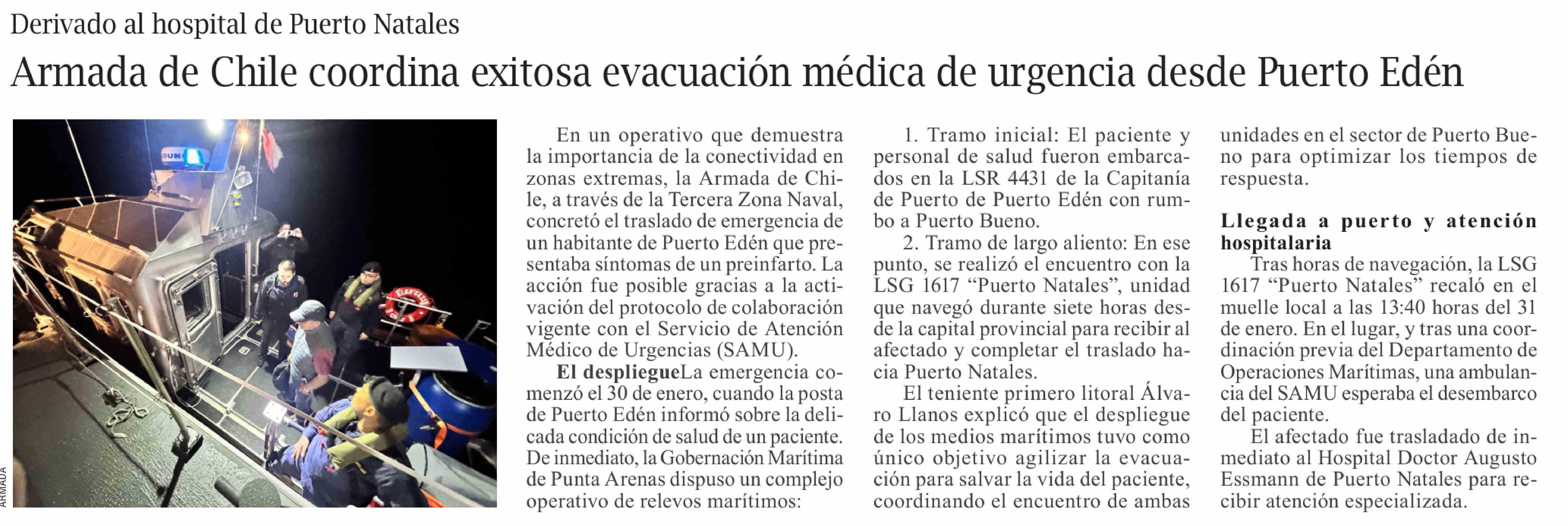 Armada de Chile coordina exitosa evacuación médica de urgencia desde Puerto Edén
