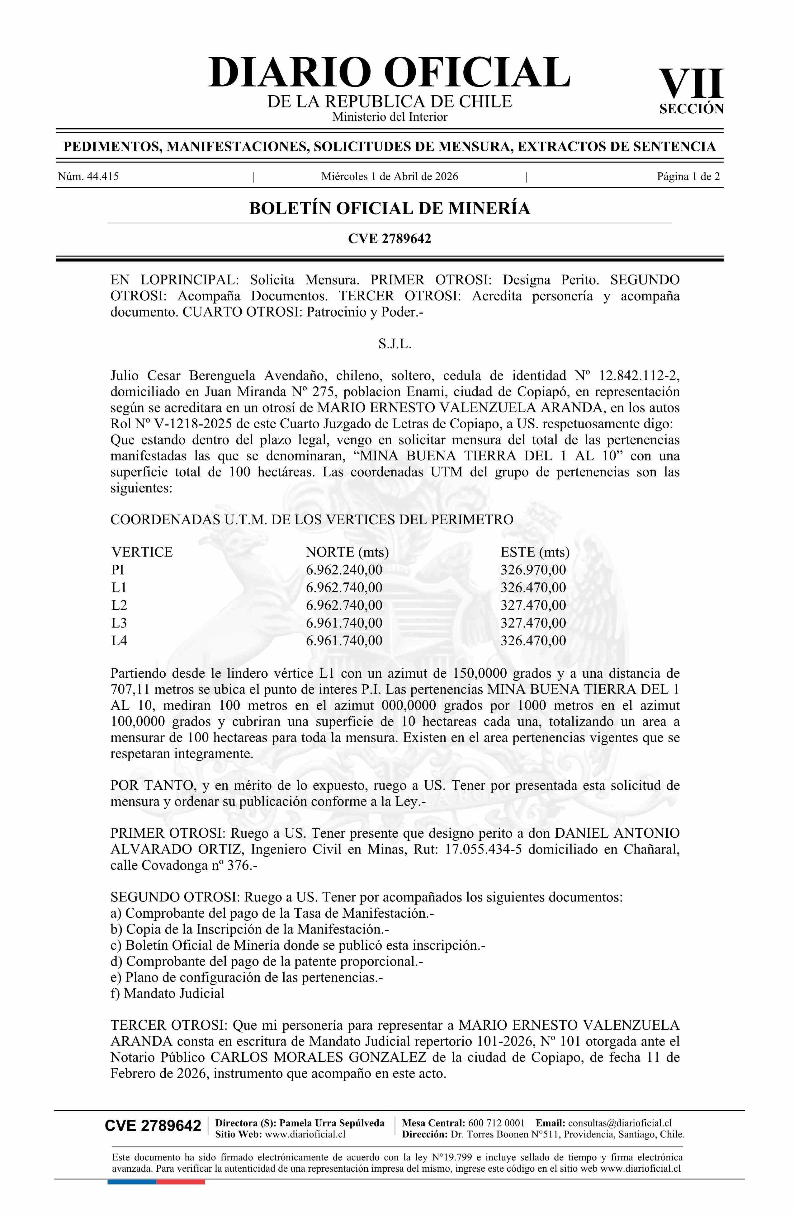 DIARIO OFICIAL CHILE - BOLETÍN OFICIAL DE MINERÍA (DIARIO OFICIAL CHILE – BOM – SOLICITUDES DE MENSUR)