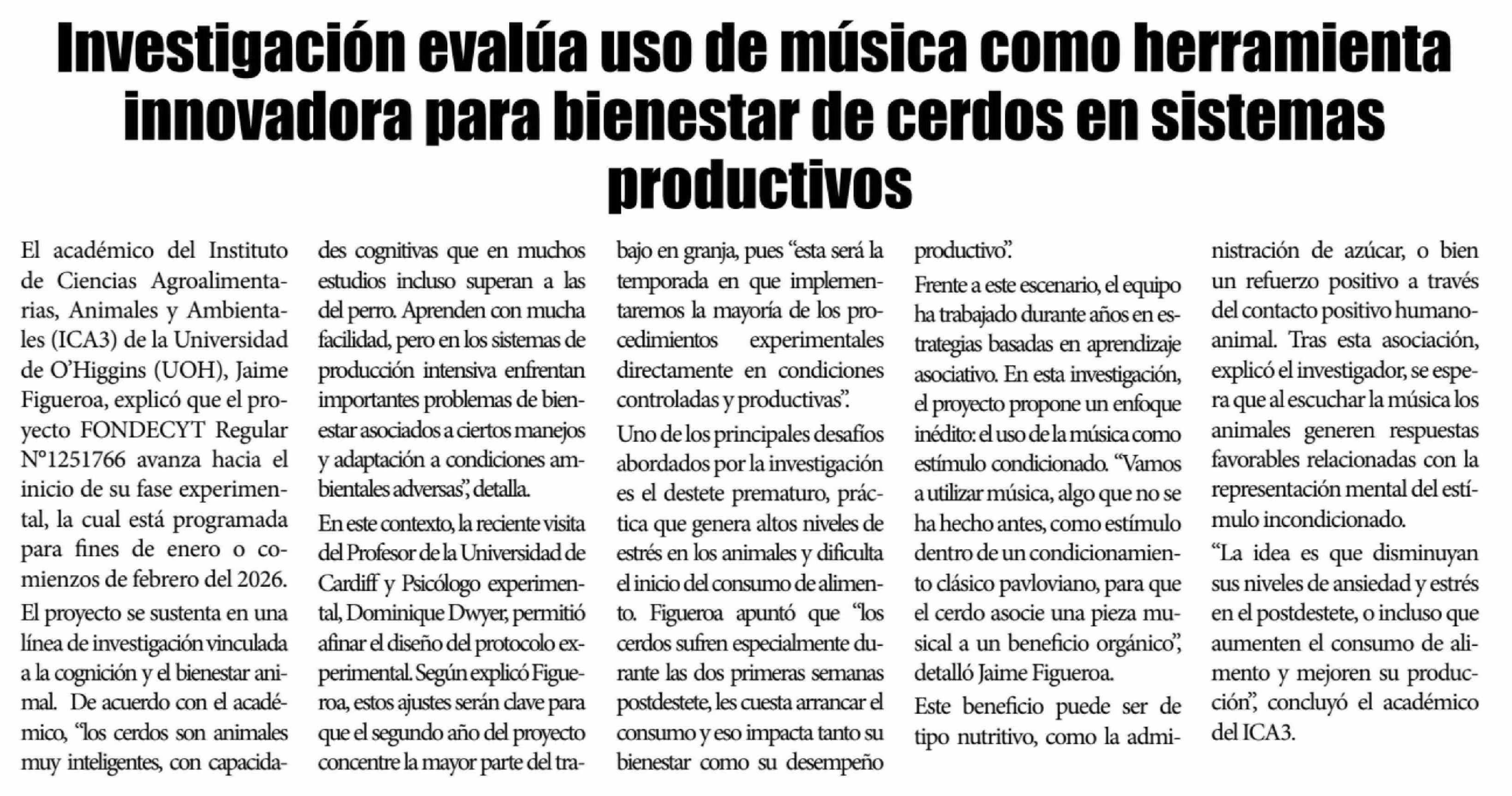 Investigación evalúa uso de música como herramienta innovadora para bienestar de cerdos en sistemas productivos