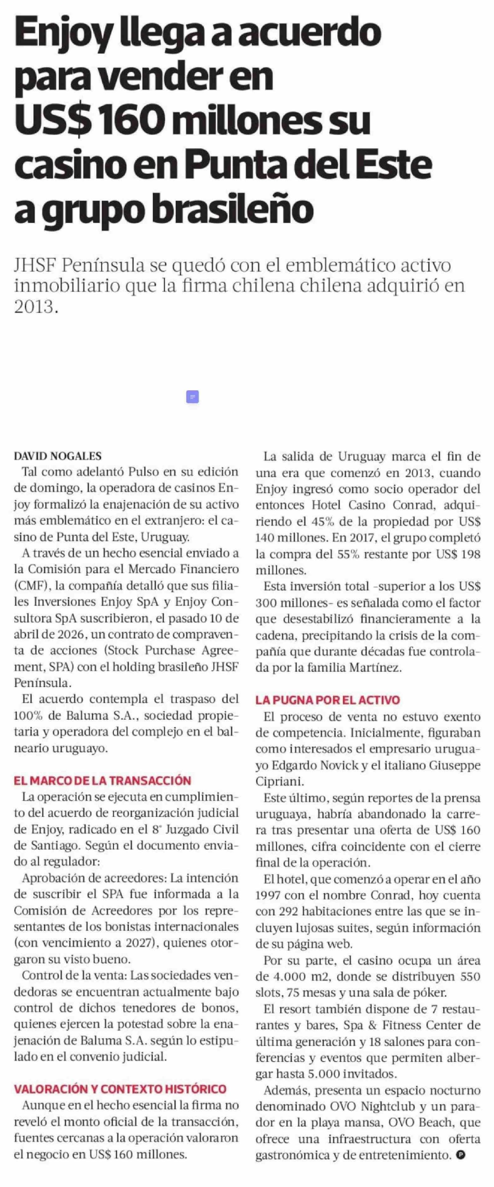 Enjoy llega a acuerdo para vender en US$ 160 millones su casino en Punta del Este a grupo brasileño