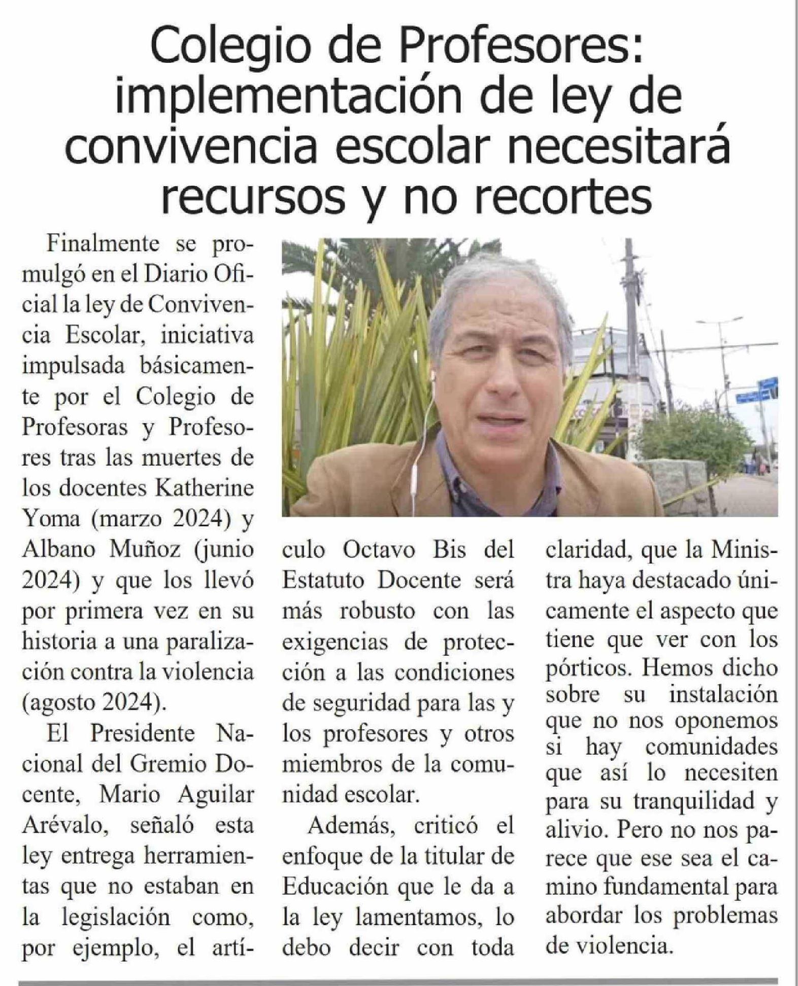 Título: Colegio de Profesores: implementación de ley de convivencia escolar necesitará recursos y no recortes