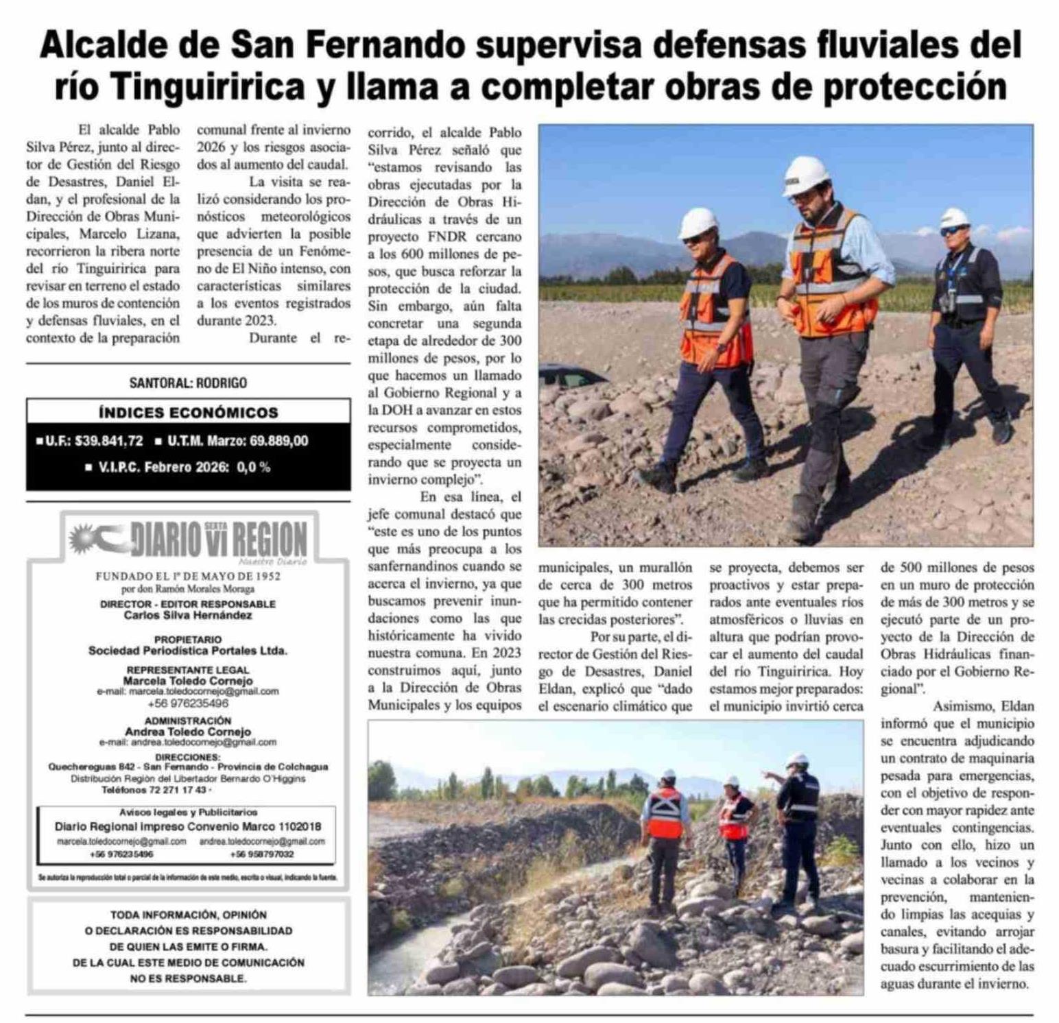 Alcalde de San Fernando supervisa defensas fluviales del rio Tinguiririca y llama a completar obras de protección