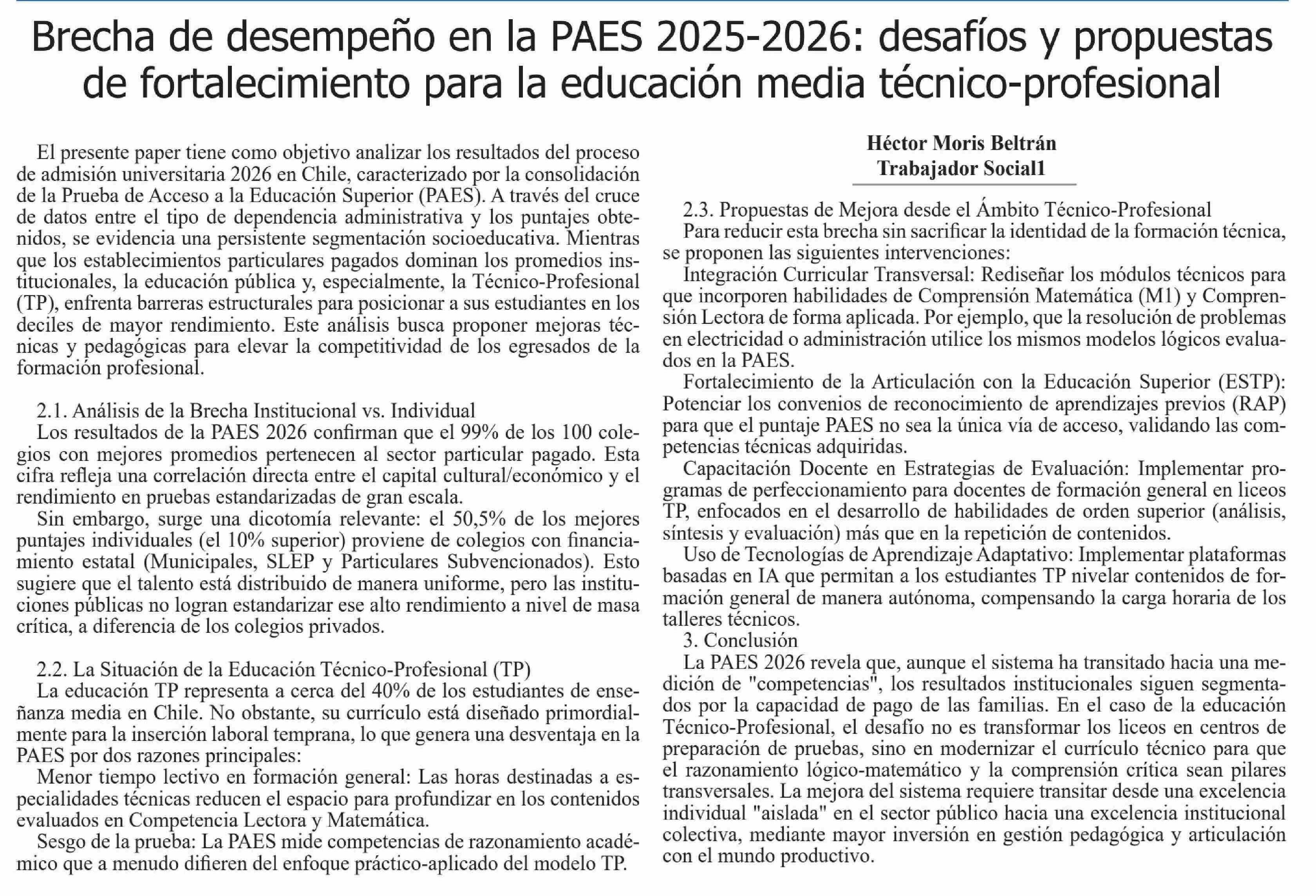 Columnas de Opinión: Brecha de desempeño en la PAES 2025-2026: desafíos y propuestas de fortalecimiento para la educación media técnico-profesional