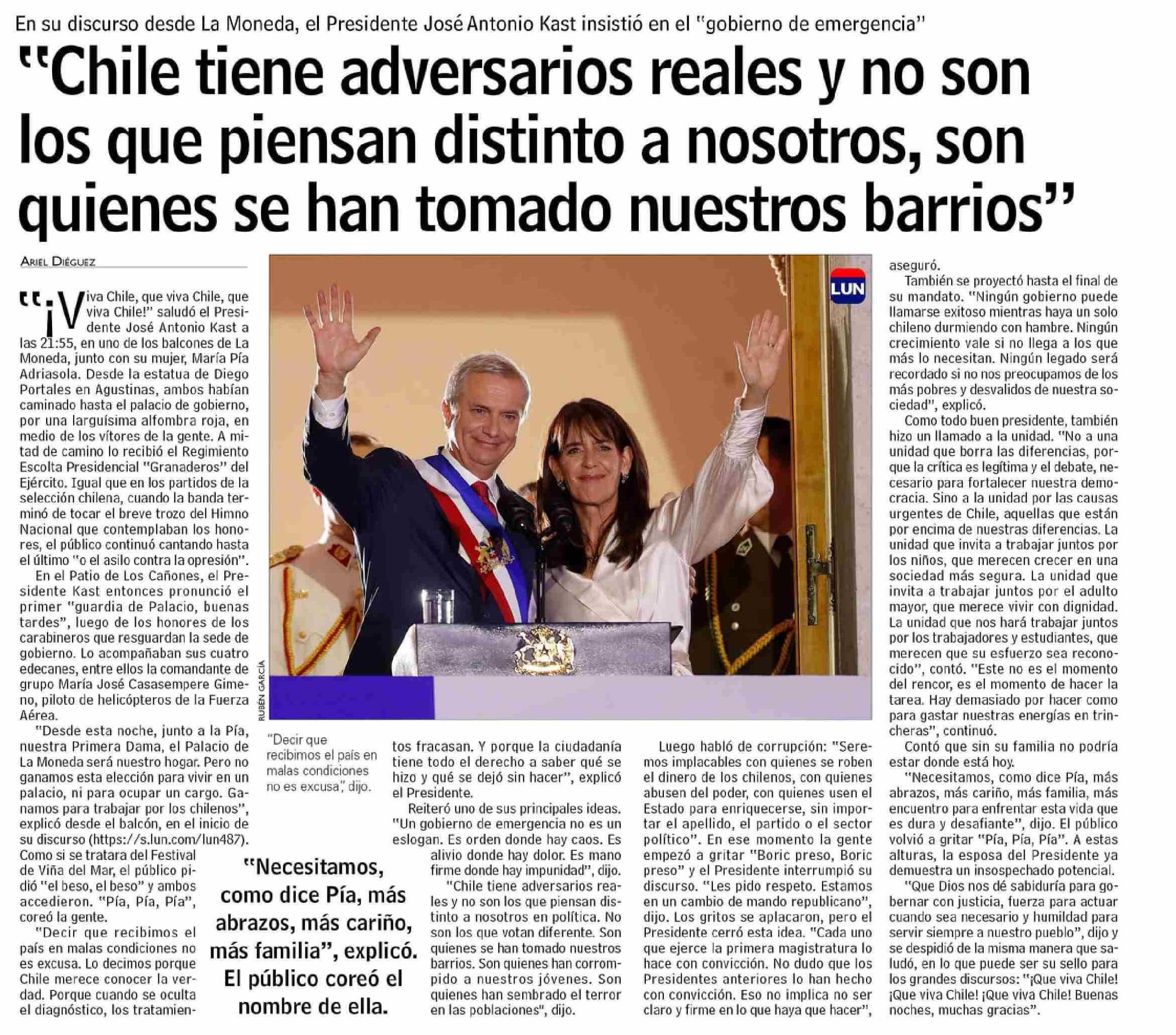 | Título: | “Chile tiene adversarios reales y no son los que piensan distinto a nosotros, son quienes se han tomado nuestros barrios” |