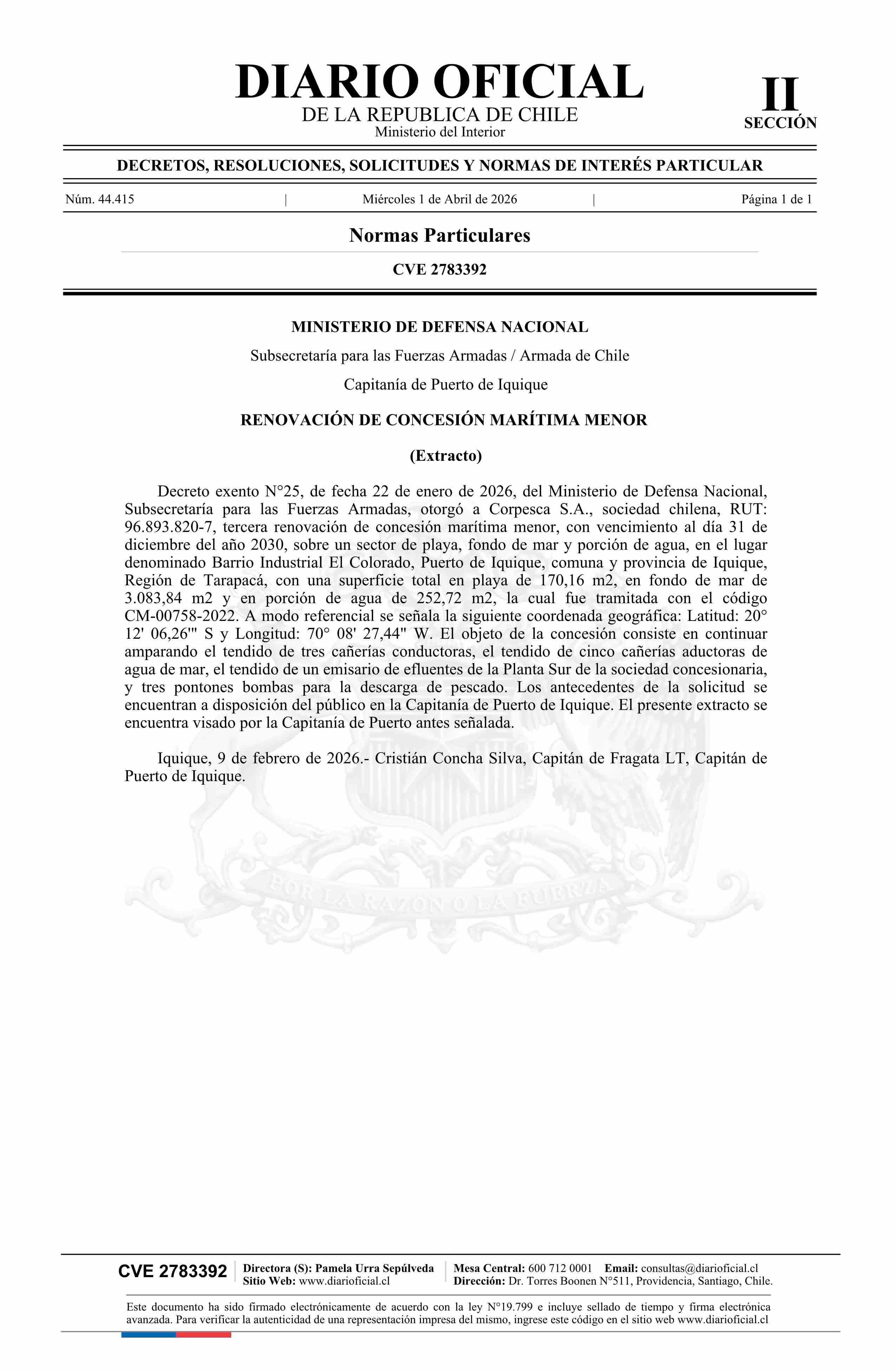 Extracto de decreto número 25, de 2026.- Renovación de concesión marítima menor