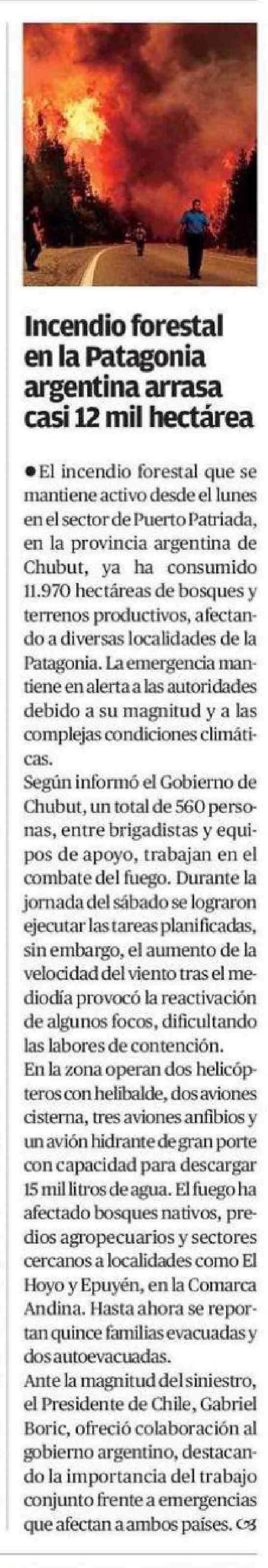 Incendio forestal en la Patagonia argentina arrasa casi 12 mil hectárea