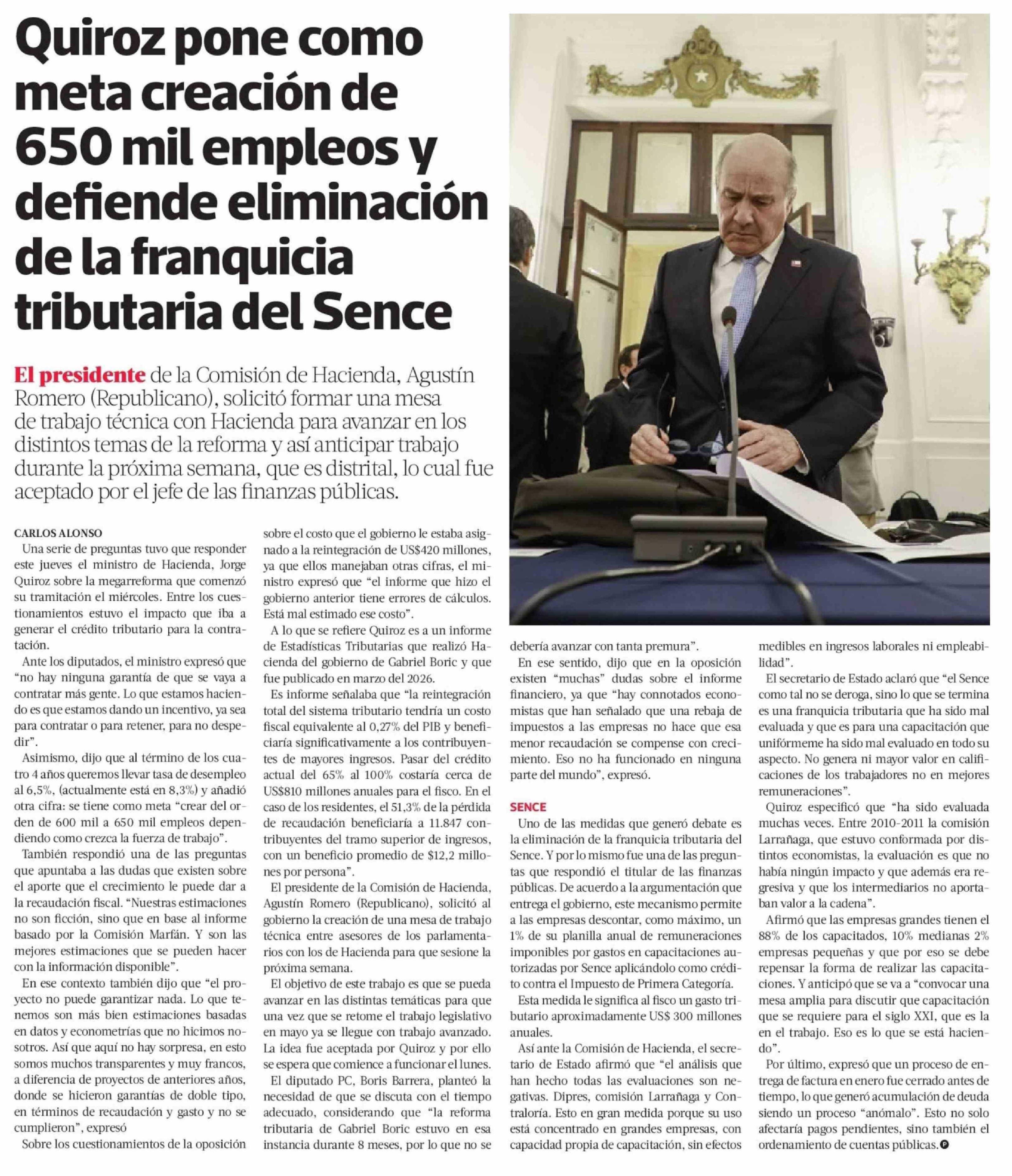 Quiroz pone como meta creación de 650 mil empleos y defiende eliminación de la franquicia tributaria del Sence