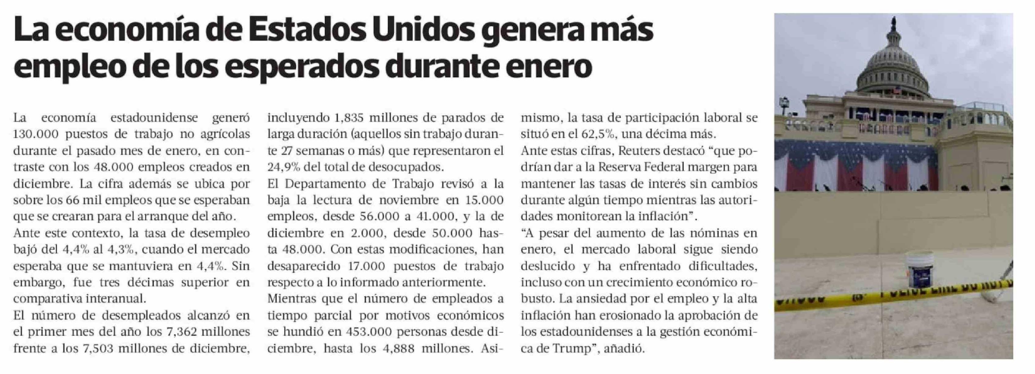 La economía de Estados Unidos genera más empleo de los esperados durante enero