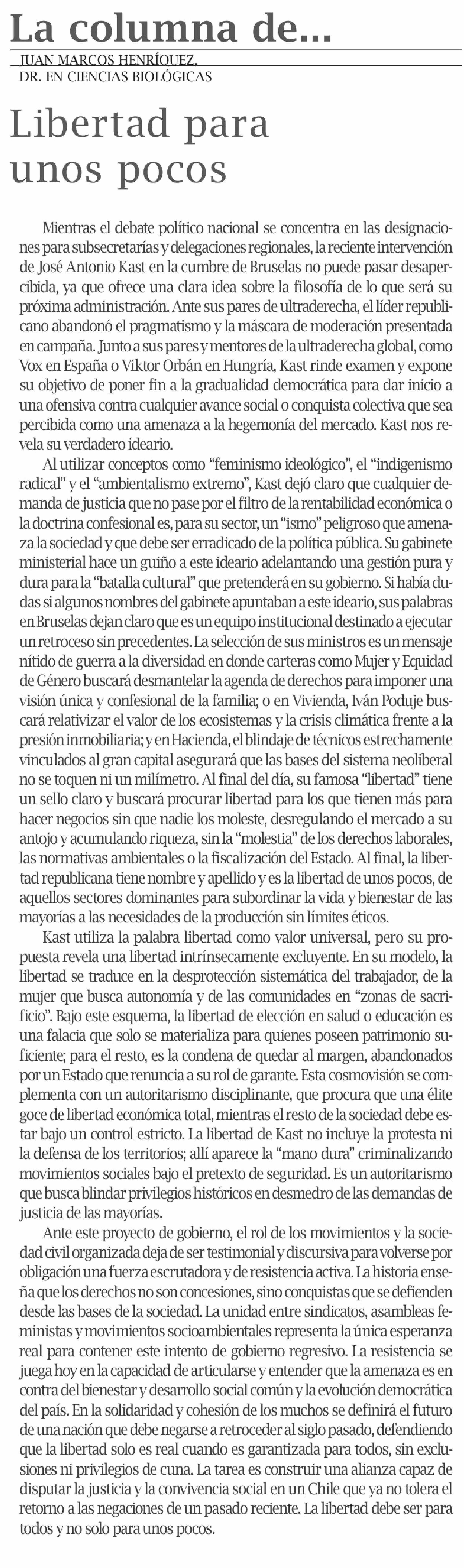 Columnas de Opinión: Libertad para unos pocos