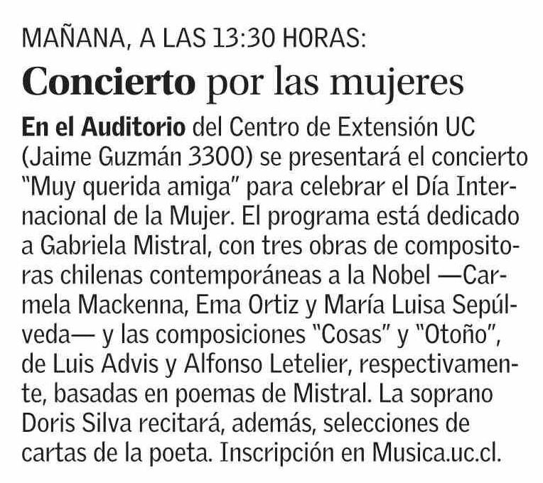 MAÑANA, A LAS 13:30 HORAS: Concierto por las mujeres