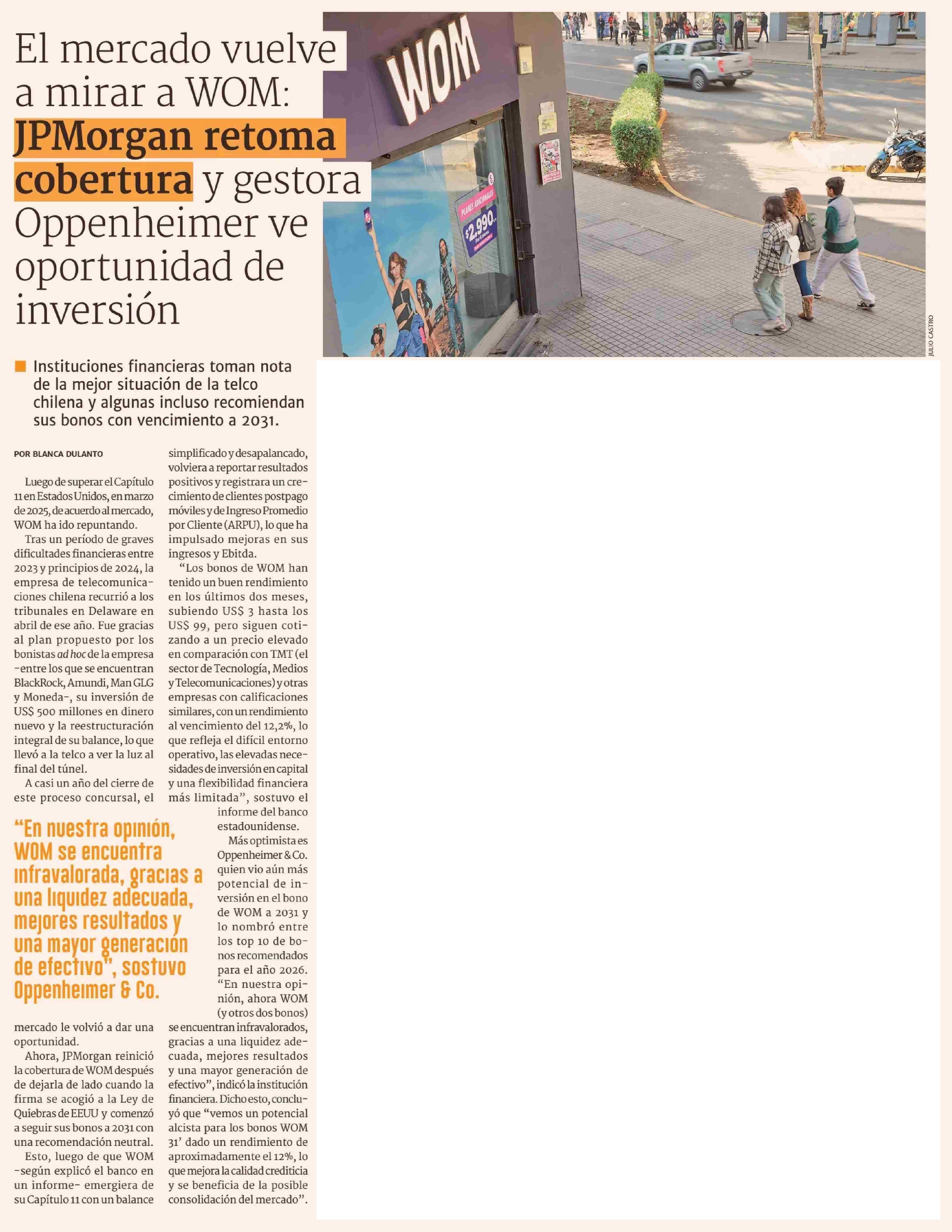 El mercado vuelve a mirar a WOM: JPMorgan retoma cobertura y gestora Oppenheimer ve oportunidad de inversión