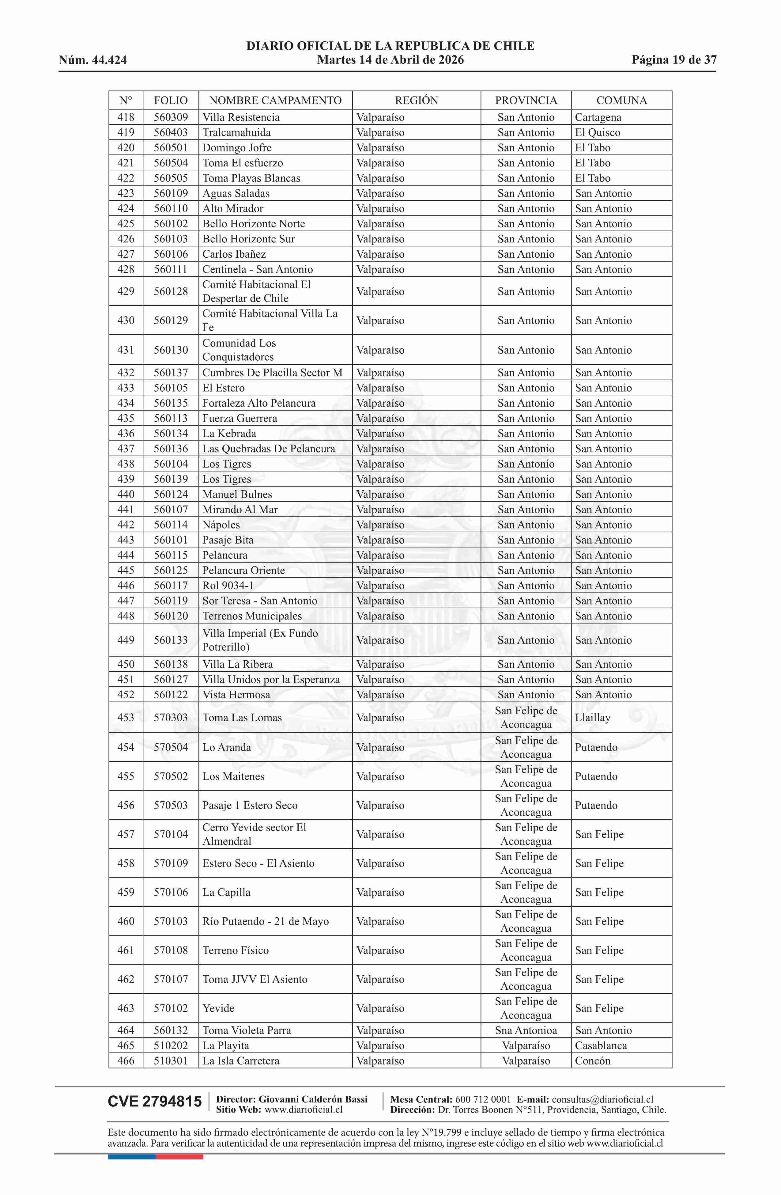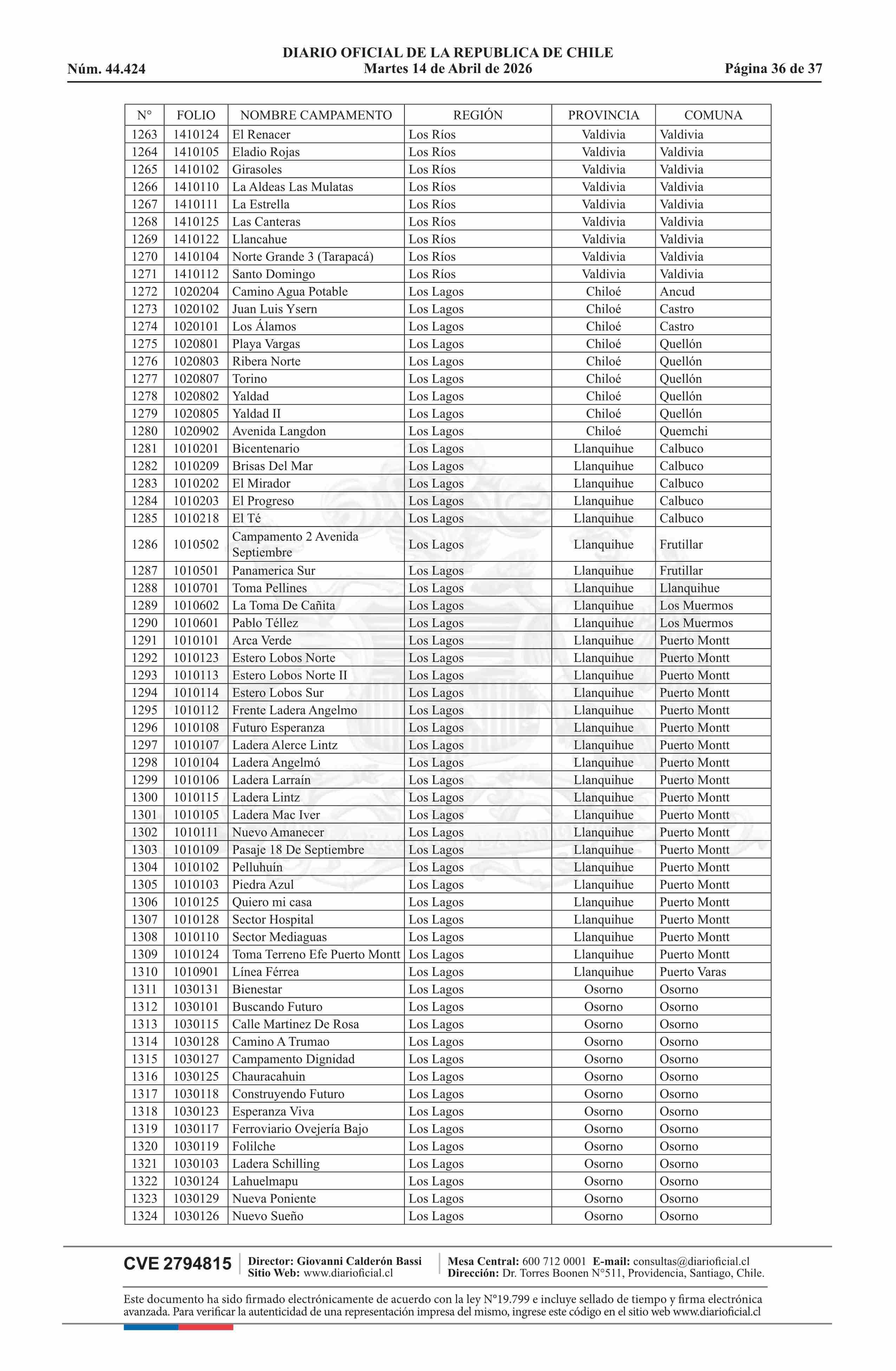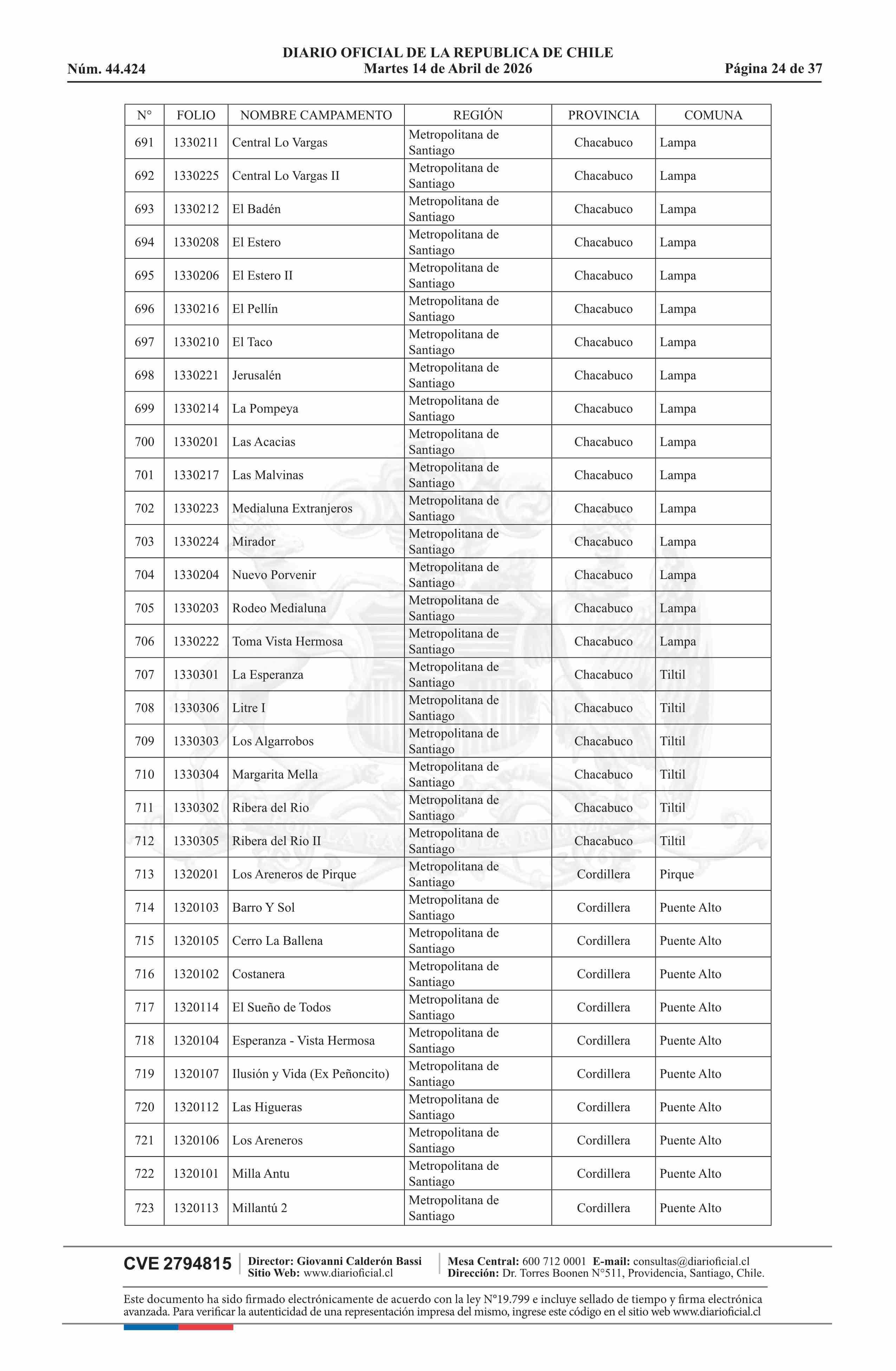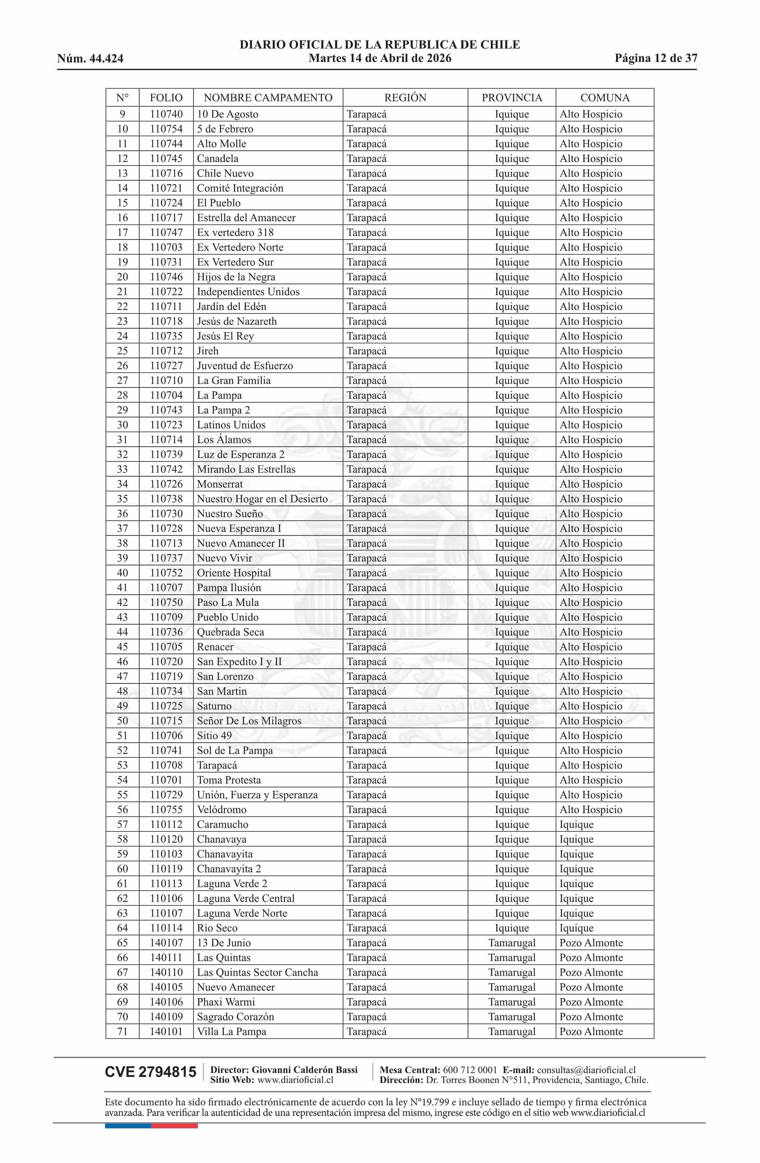 | Título: | Resolución exenta número 377, de 2026.- Aprueba actualización del Registro Histórico de Campamentos y actualización del Registro Vigente de Campamentos, del Catastro de Asentamientos Precarios al 27 de febrero de 2026, y revoca las resoluciones N°s. 335 y 713 exentas, de 2024 |