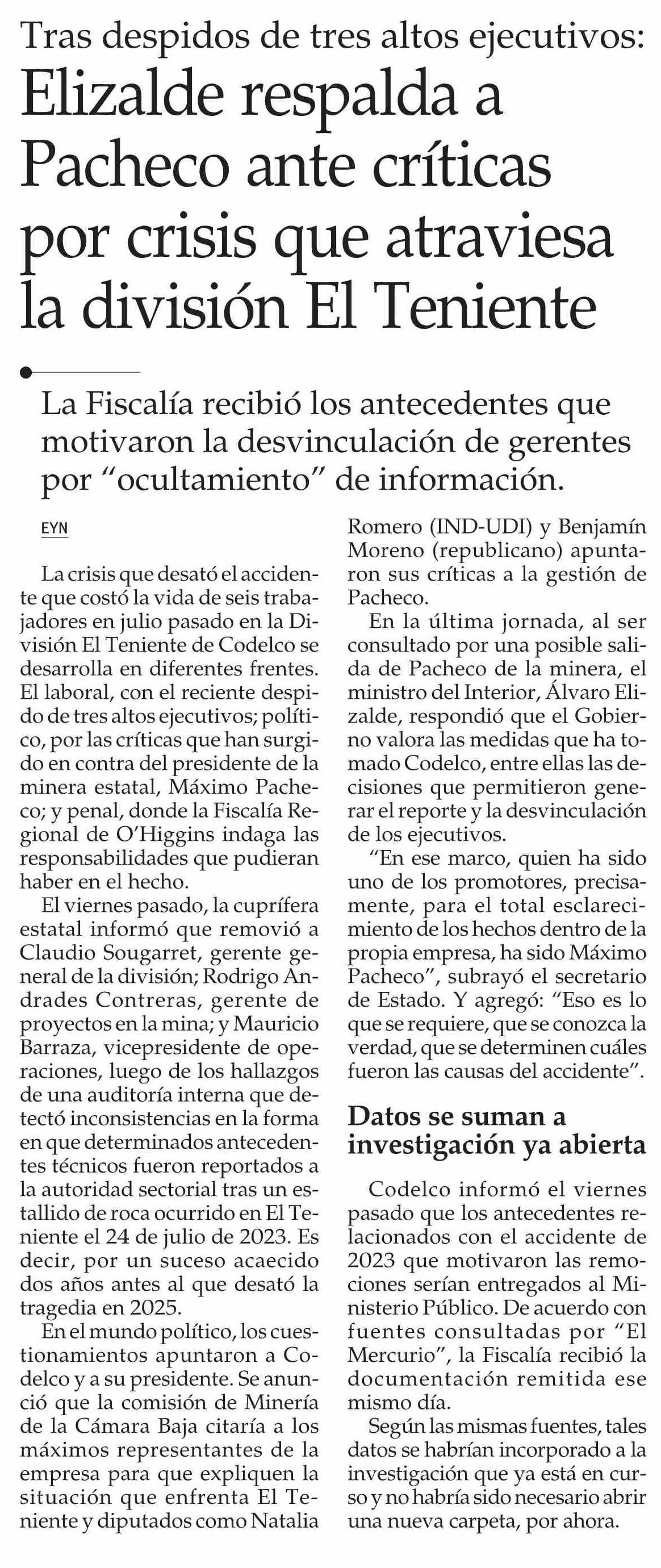 Elizalde respalda a Pacheco ante críticas por crisis que atraviesa la división El Teniente
