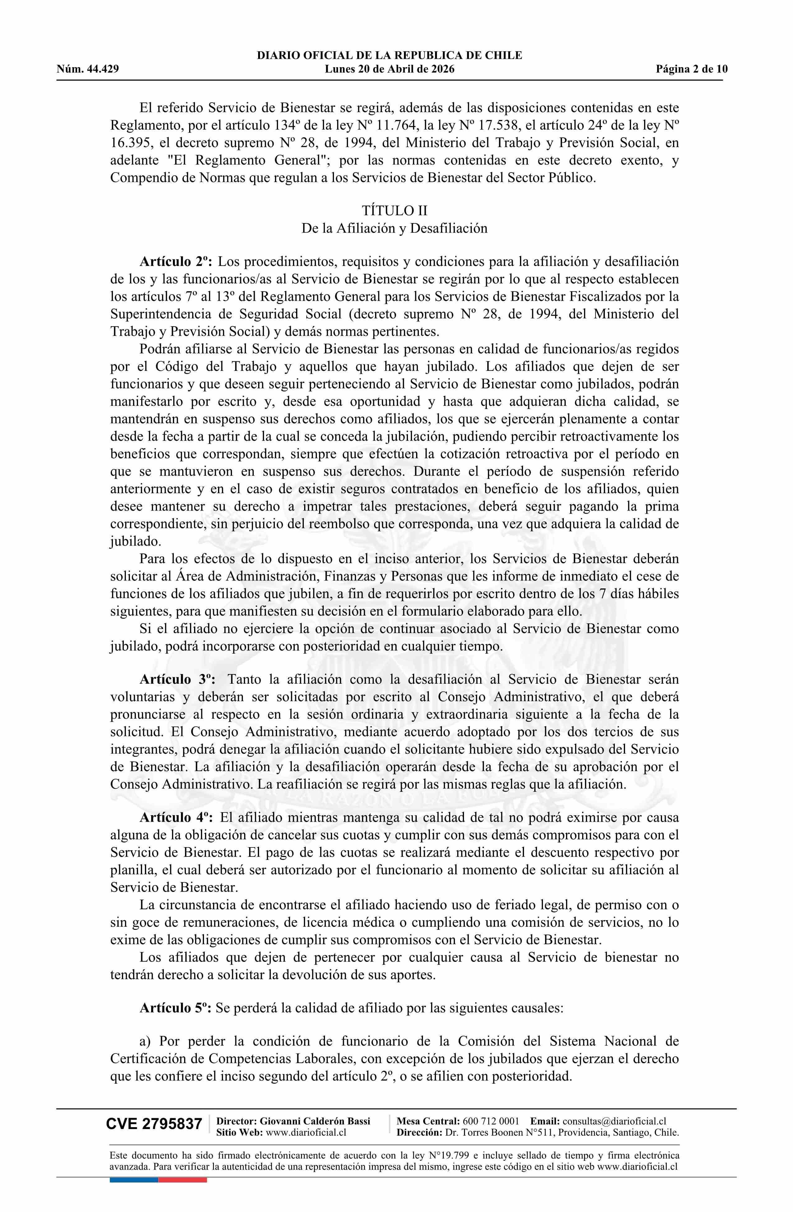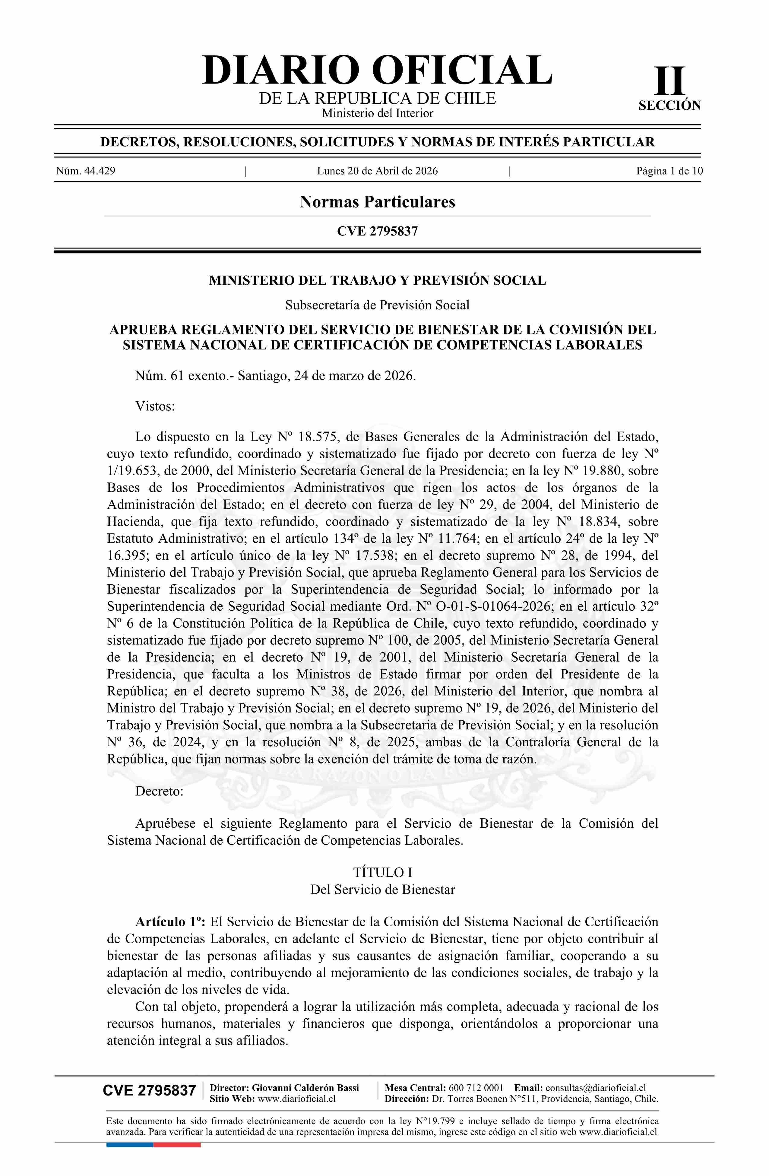 Título: Decreto exento número 61, de 2026.- Aprueba reglamento del Servicio de Bienestar de la Comisión del Sistema Nacional de Certificación de Competencias Laborales