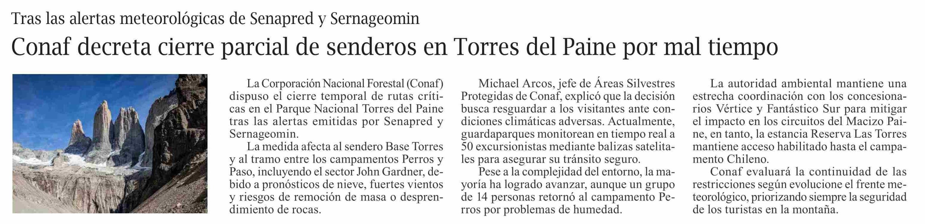 Conaf decreta cierre parcial de senderos en Torres del Paine por mal tiempo