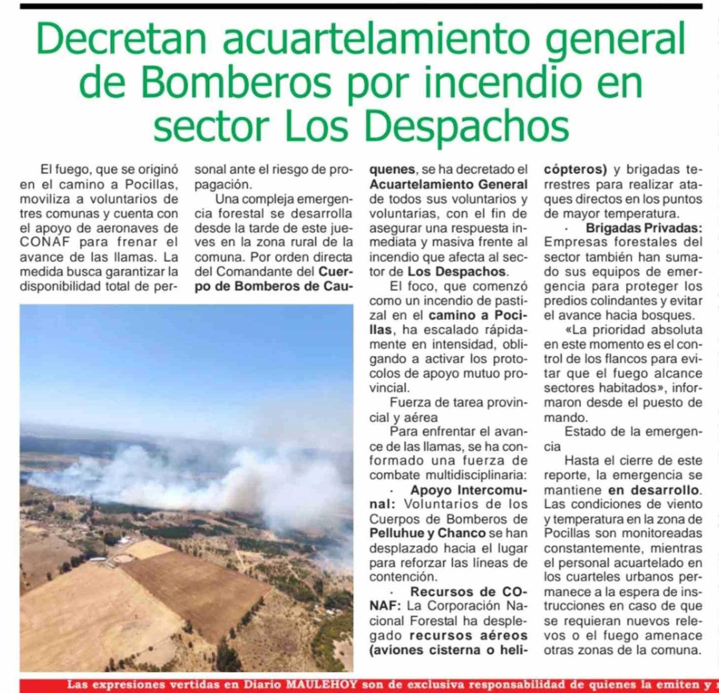 Decretan acuartelamiento general de Bomberos por incendio en sector Los Despachos