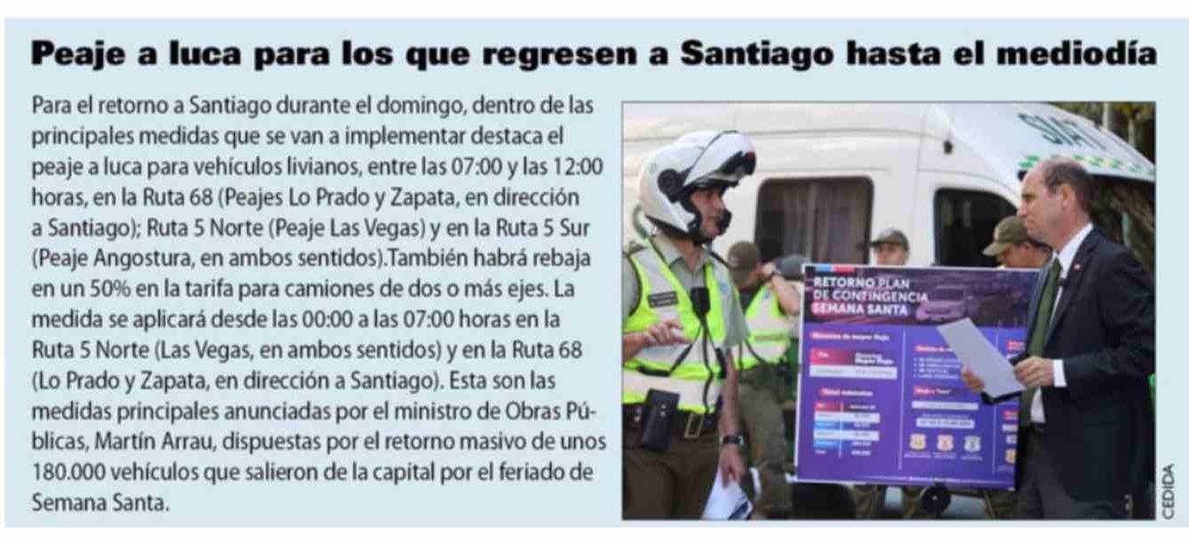 Peaje a luca para los que regresen a Santiago hasta el mediodía
