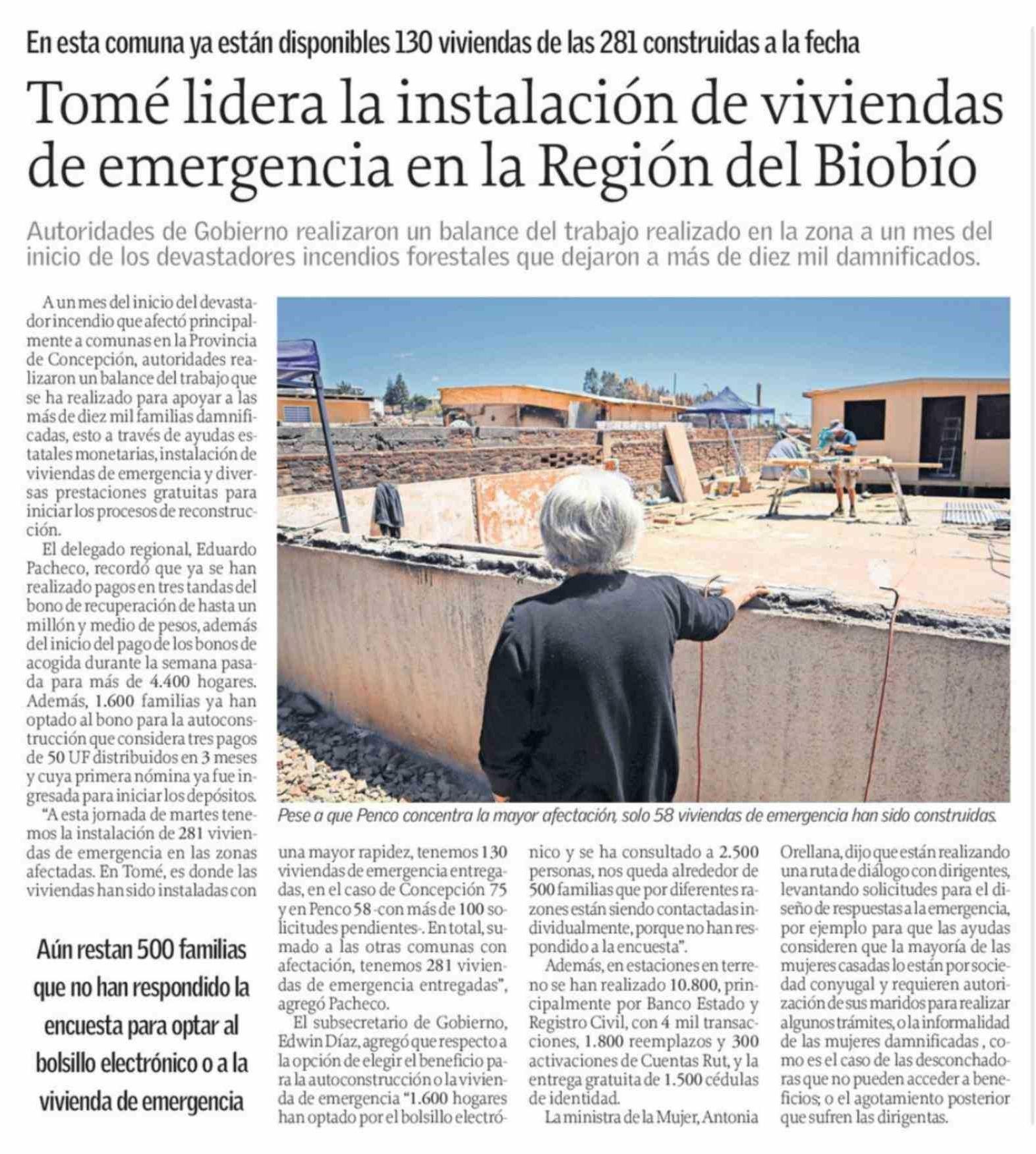 Tomé lidera la instalación de viviendas de emergencia en la Región del Biobío