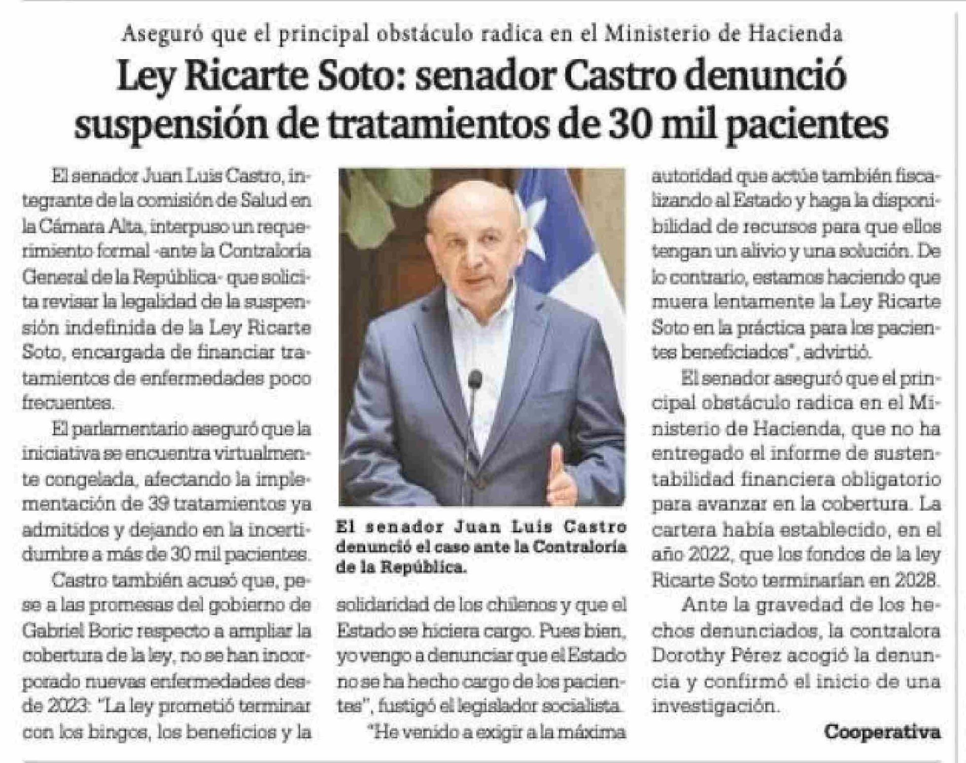 Ley Ricarte Soto: senador Castro denunció suspensión de tratamientos de 30 mil pacientes