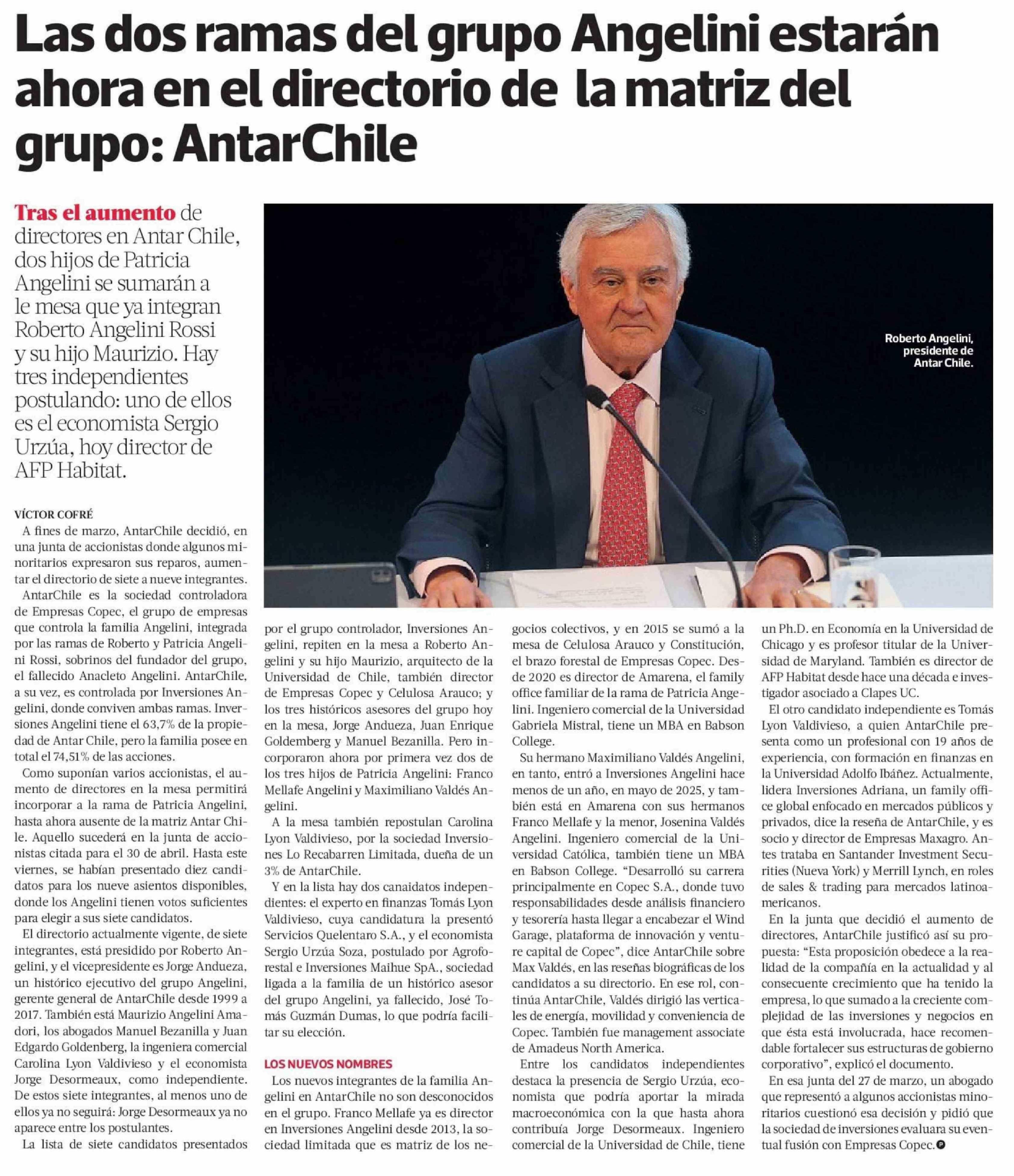 Título: Las dos ramas del grupo Angelini estarán ahora en el directorio de la matriz del grupo: AntarChile