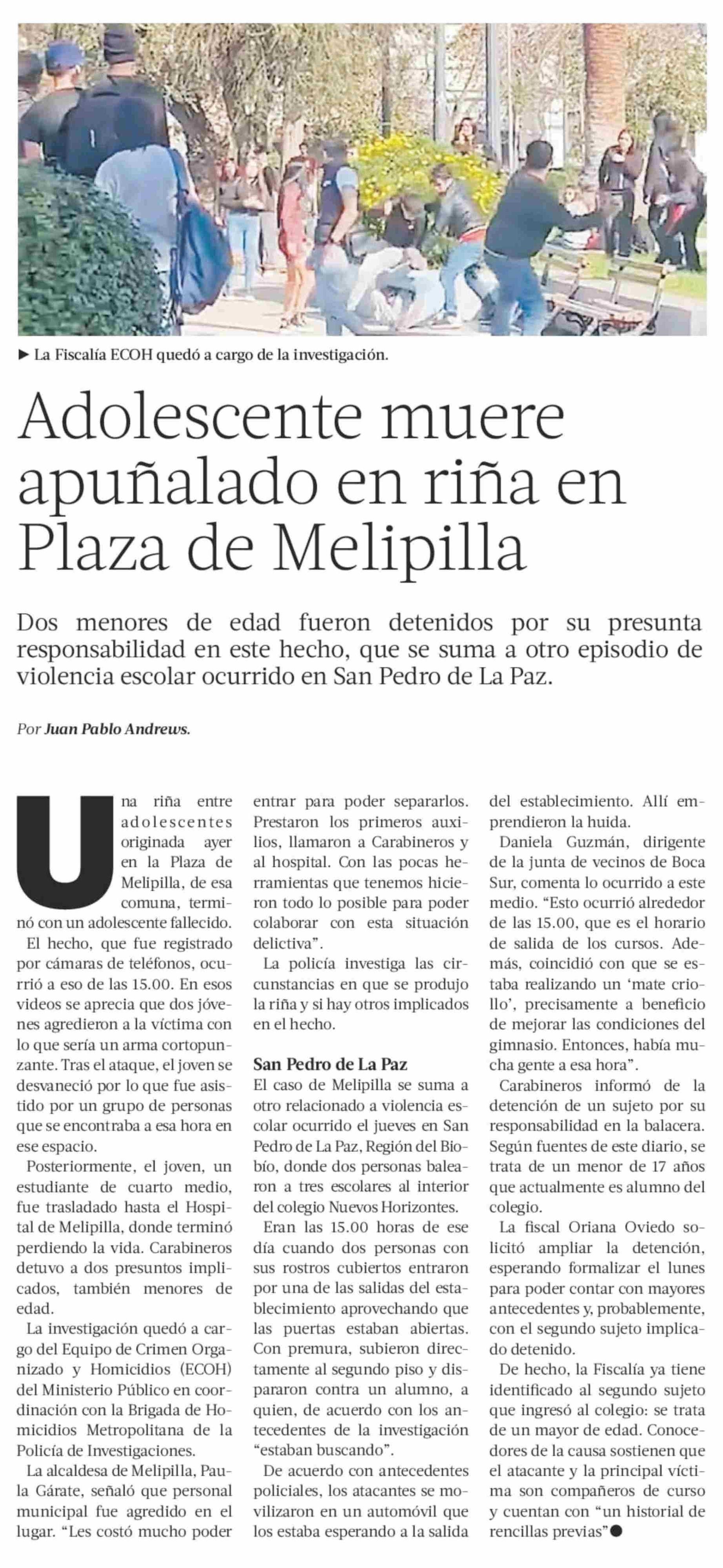 Adolescente muere apuñalado en riña en Plaza de Melipilla