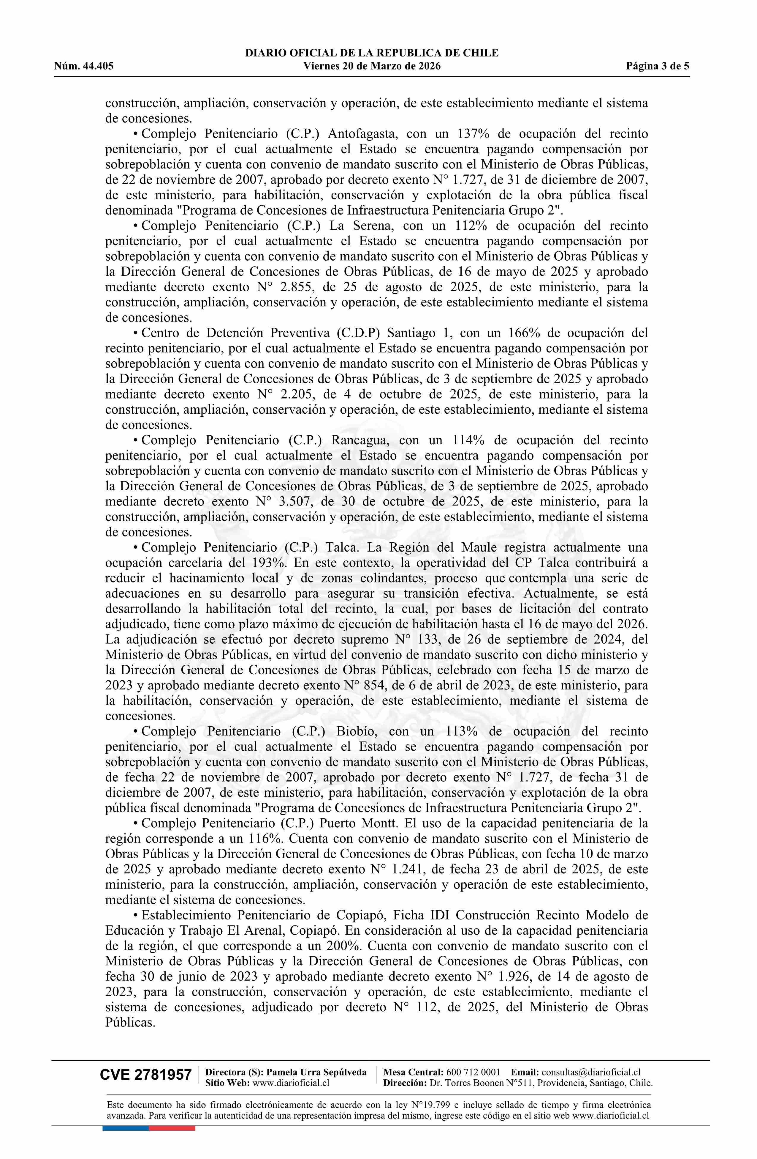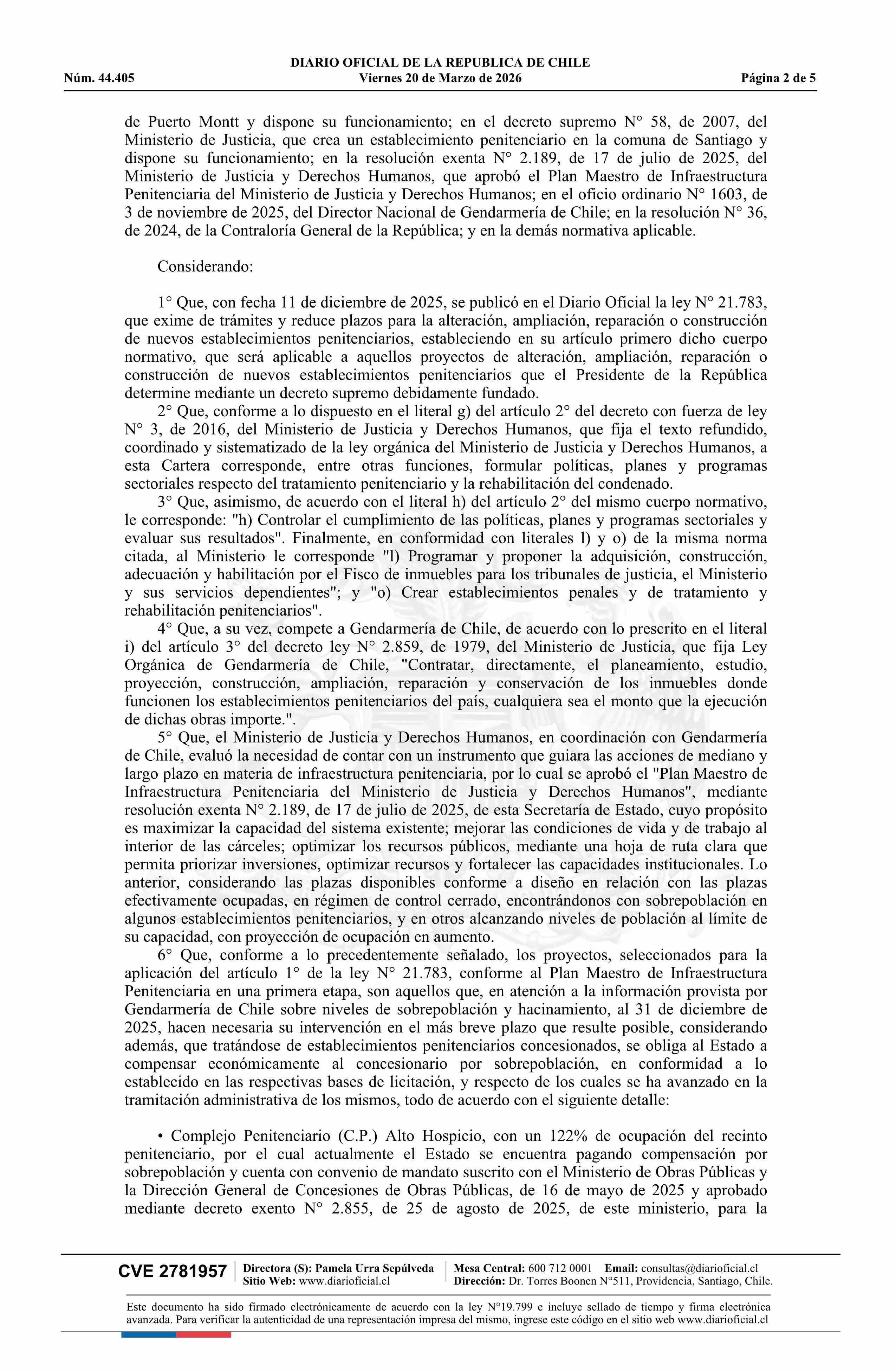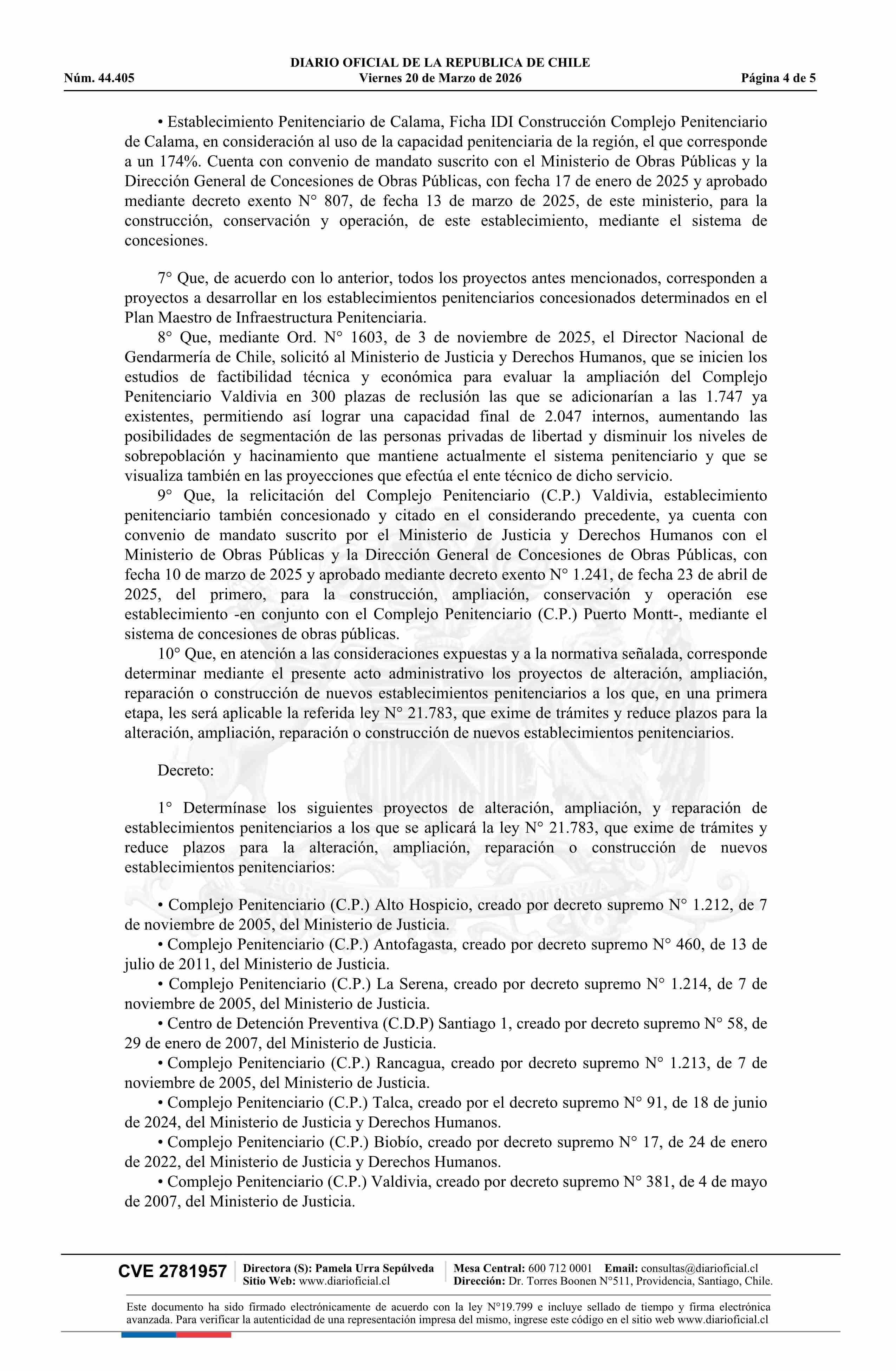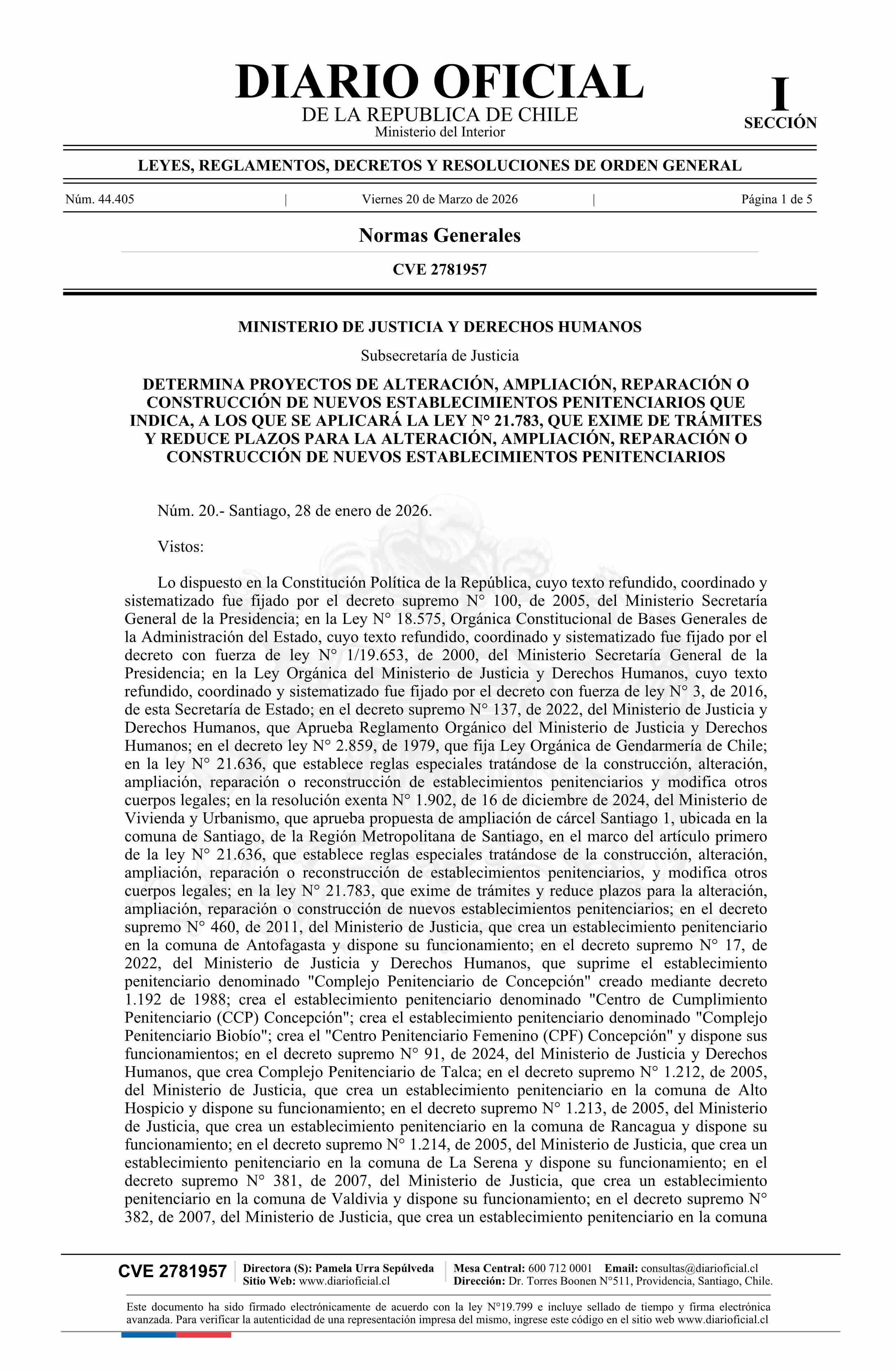 Título: Decreto número 20, de 2026.- Determina proyectos de alteración, ampliación, reparación o construcción de nuevos establecimientos penitenciarios que indica, a los que se aplicará la ley N° 21.783, que exime de trámites y reduce plazos para la alteración, ampliación, reparación o construcción de nuevo