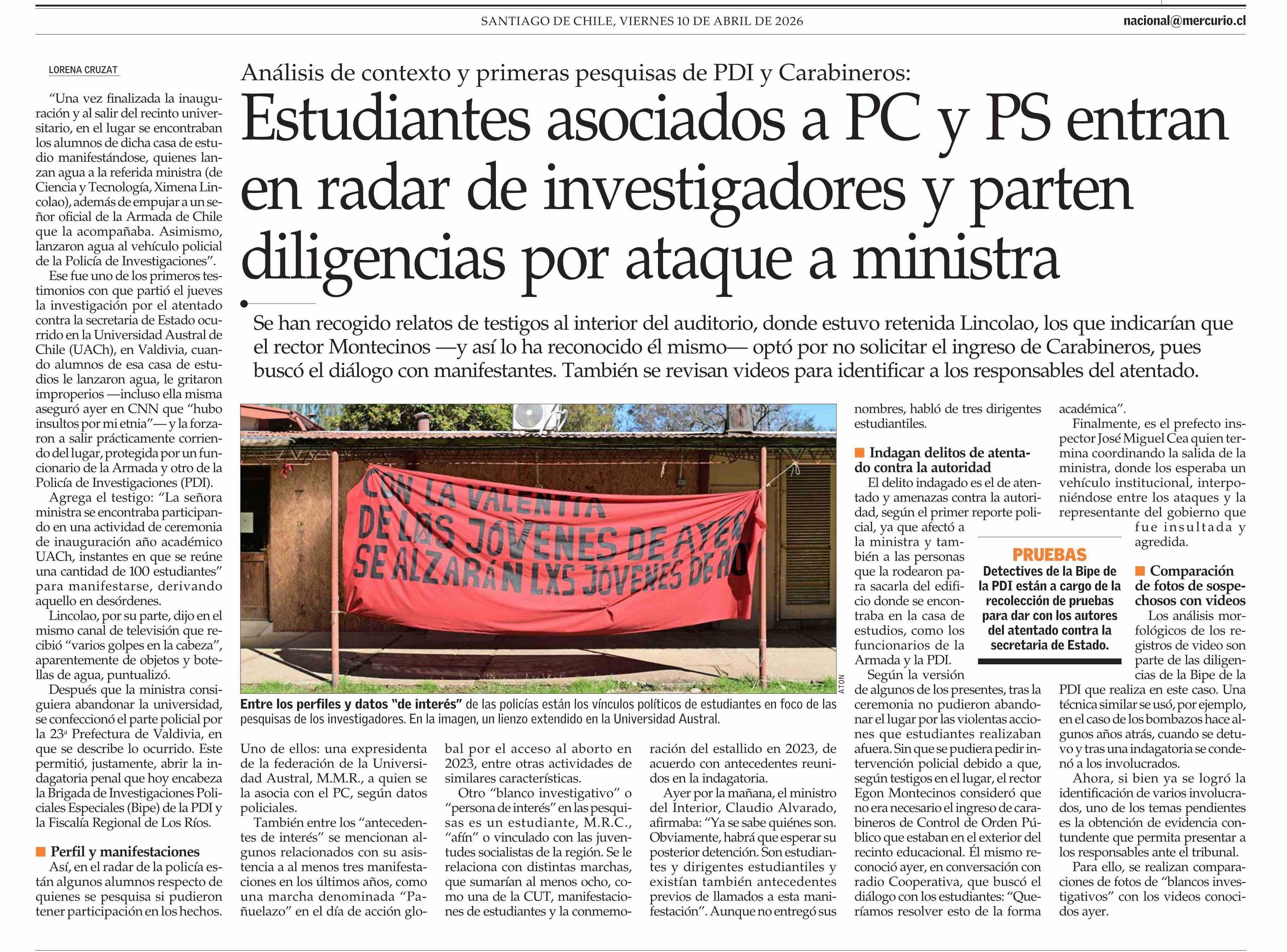 Estudiantes asociados a PC y PS entran en radar de investigadores y parten diligencias por ataque a ministra