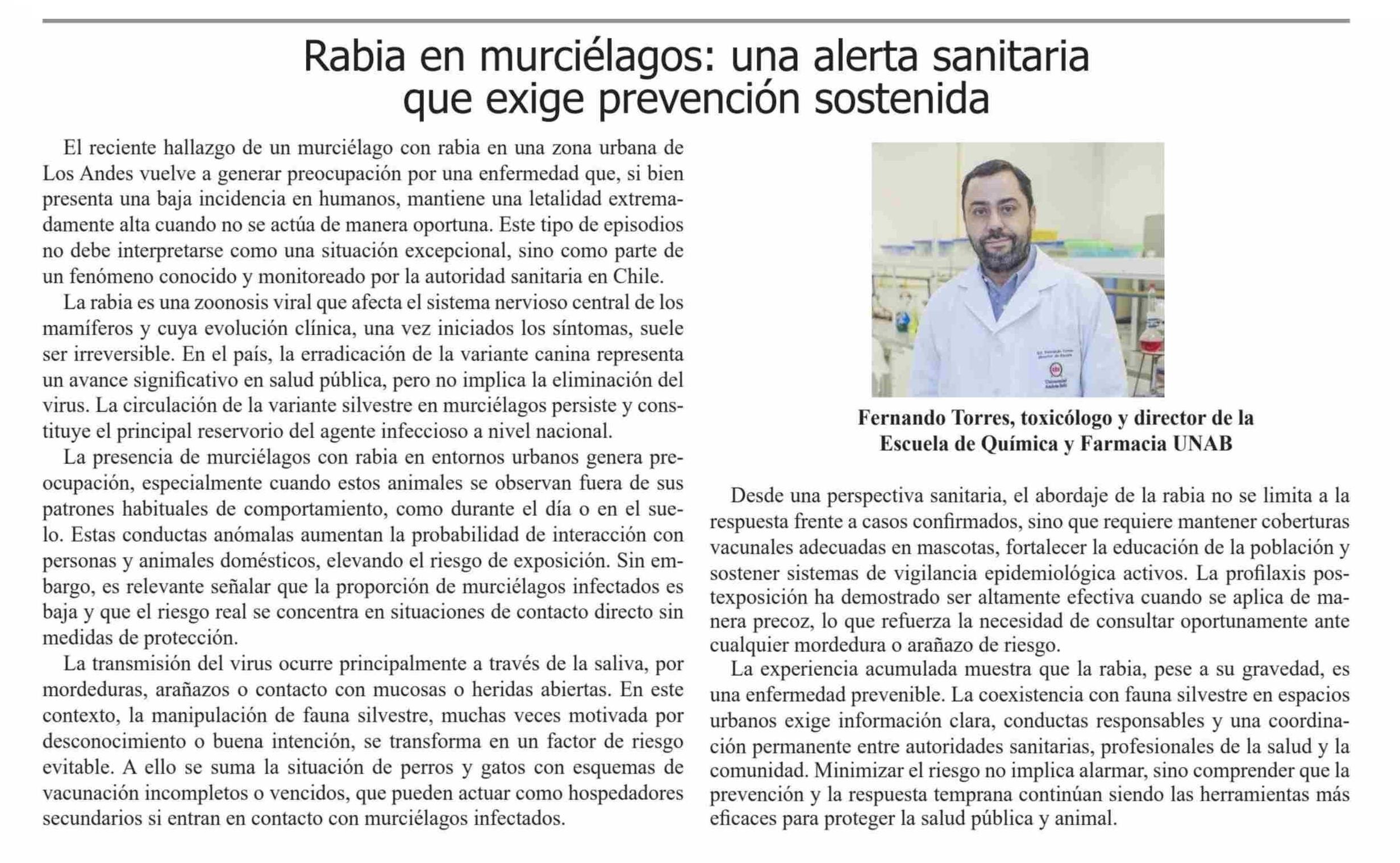Título: COLUMNAS DE OPINIÓN: Rabia en murciélagos: una alerta sanitaria que exige prevención sostenida