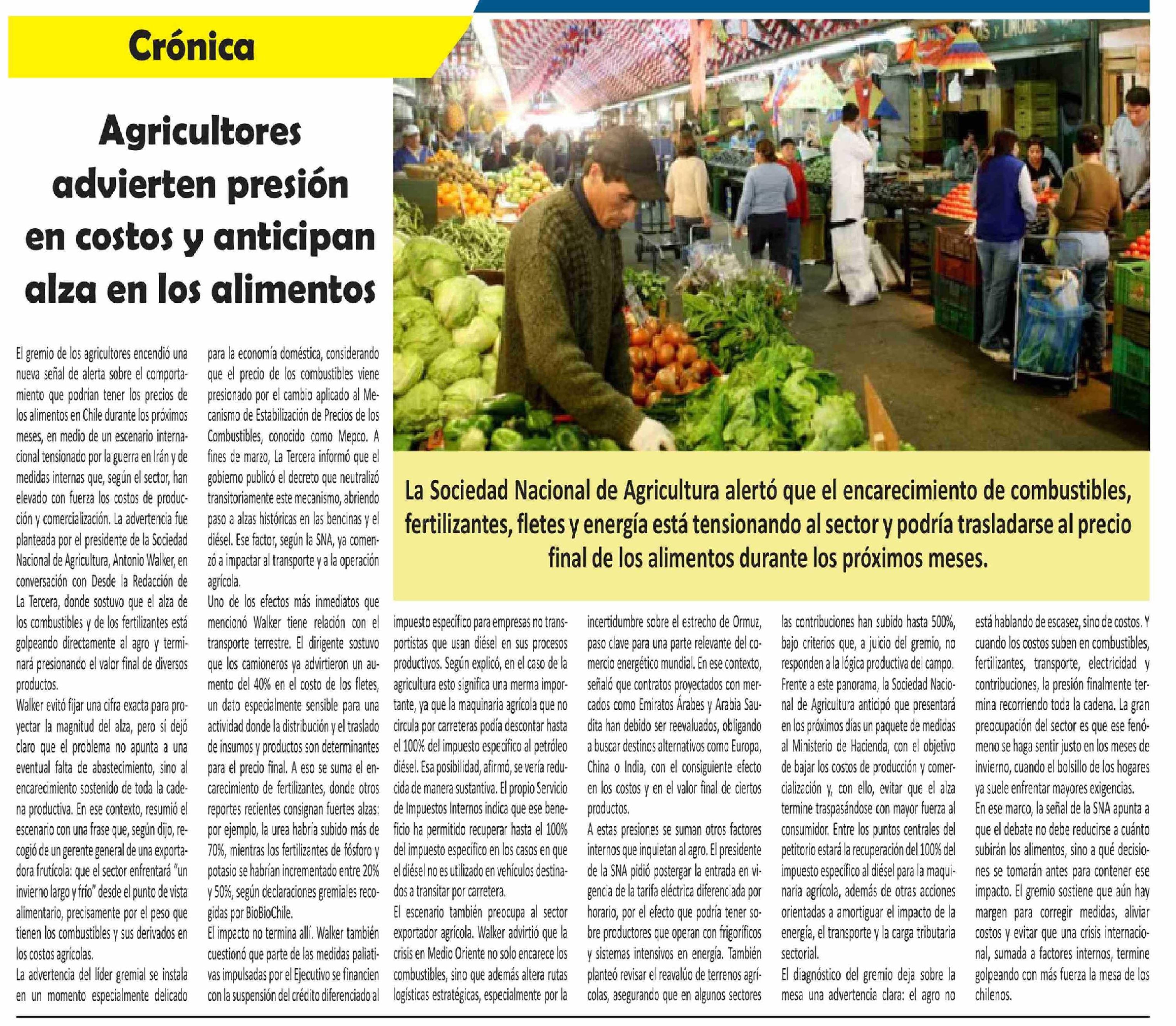 Agricultores advierten presión en costos y anticipan alza en los alimentos