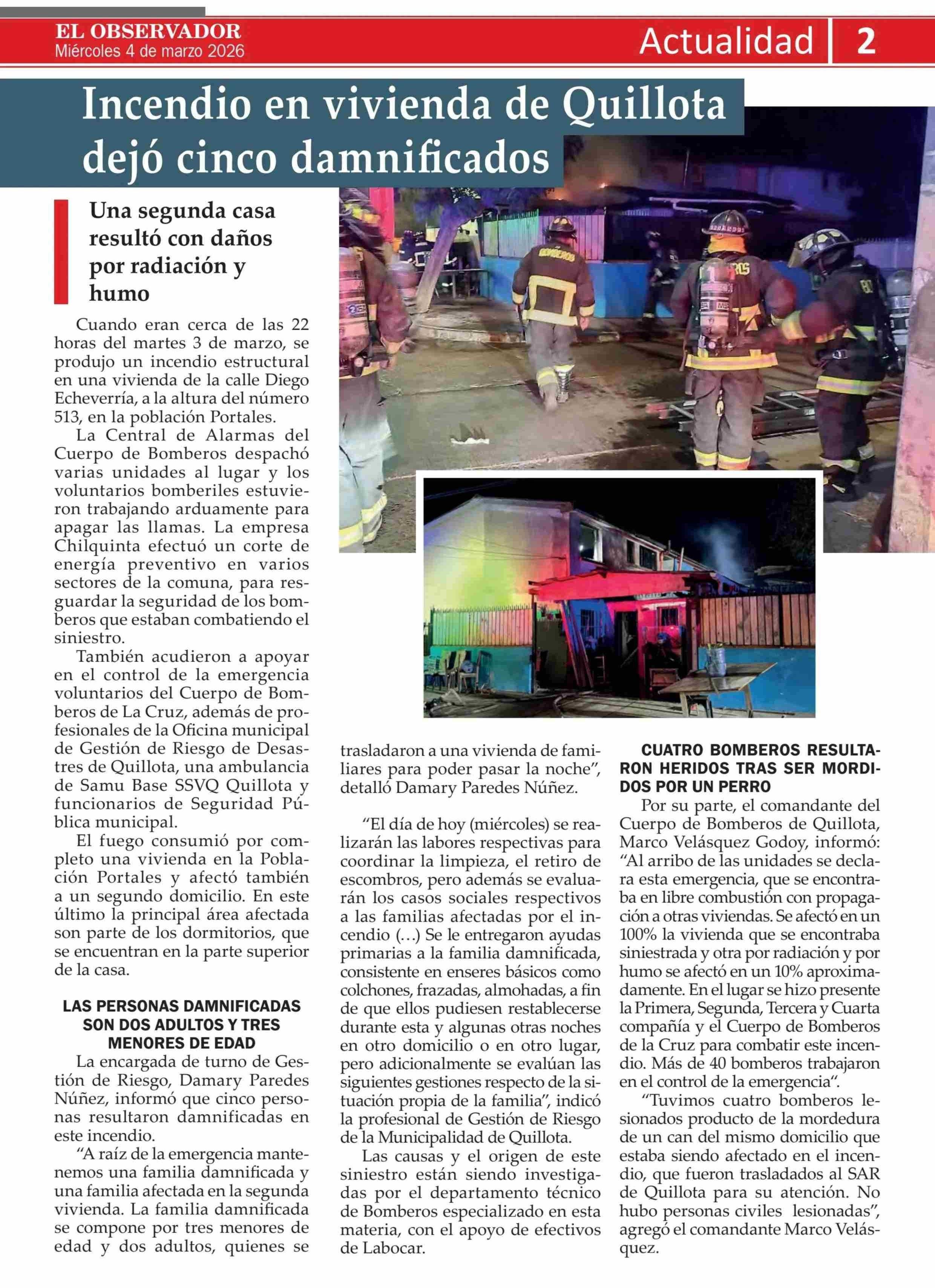 Incendio en vivienda de Quillota dejó cinco damnificados