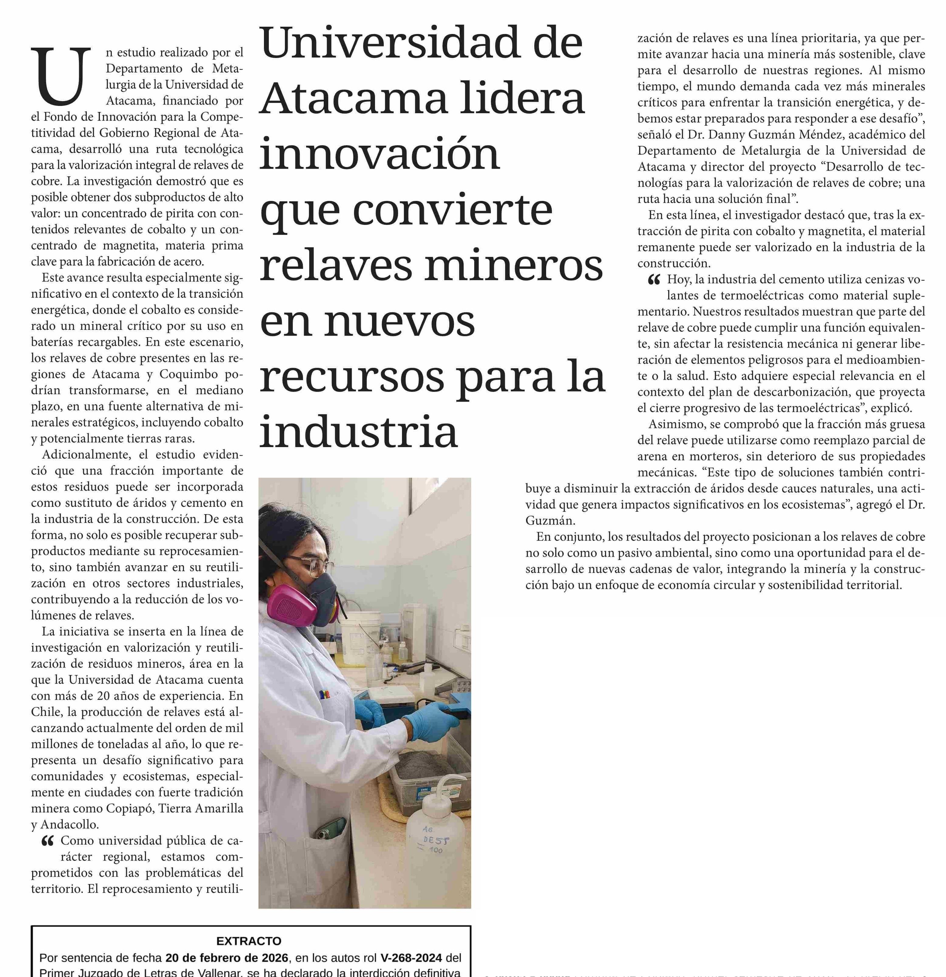 Título: Universidad de Atacama lidera innovación que convierte relaves mineros en nuevos recursos para la industria