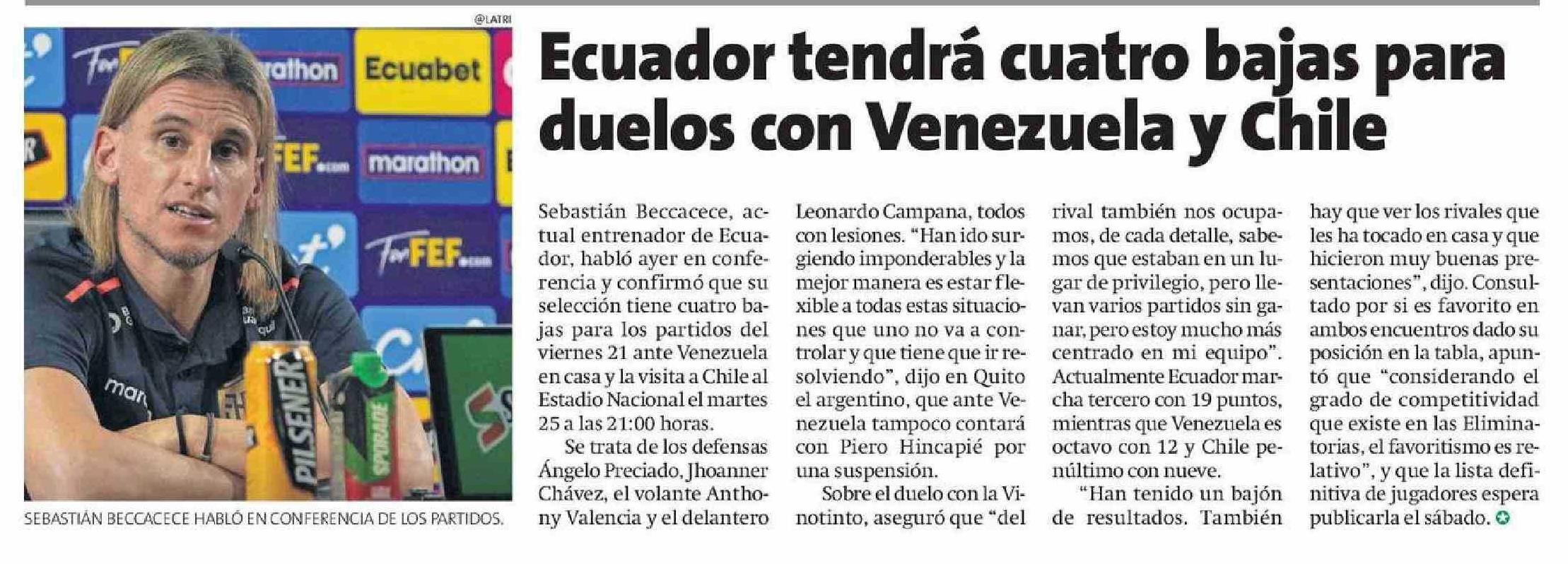 Ecuador tendrá cuatro bajas para duelos con Venezuela y Chile