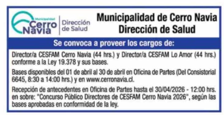 | Título: | Extractos: Municipalidad de Cerro Navia Dirección de Salud Dirección de Salud Cerro Navia Se convoca a proveer los cargos de: Director/a CESFAM Cerro Navia (44 hrs.) y Director/a CESFAM Lo Amor (44 hrs.) conforme a la Ley 19.378 y sus bases. Bases disponibles del 01 de abril al 30 de abril en Oficin |