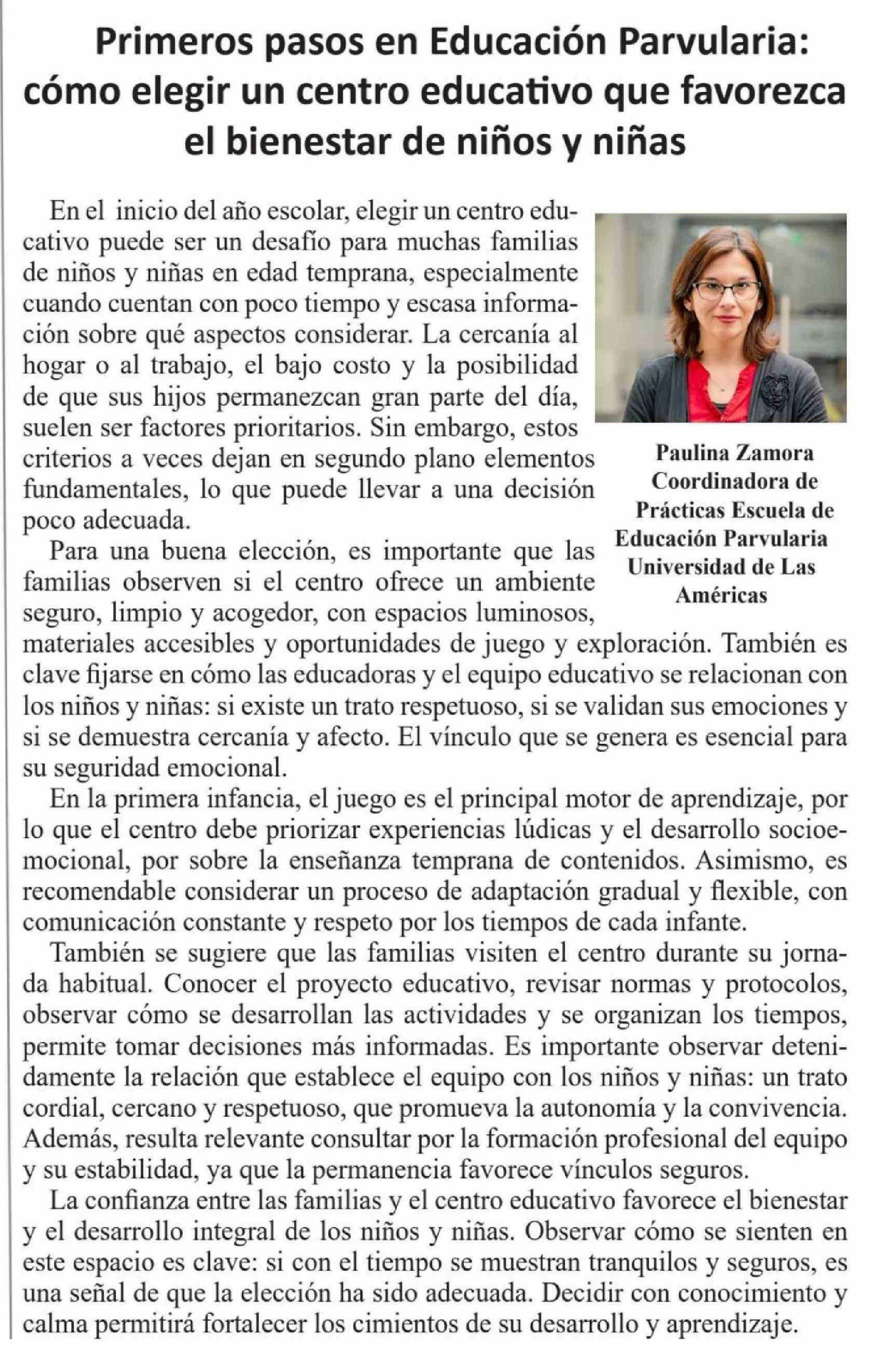 Título: Columnas de Opinión: Primeros pasos en Educación Parvularia: cómo elegir un centro educativo que favorezca el bienestar de niños y niñas