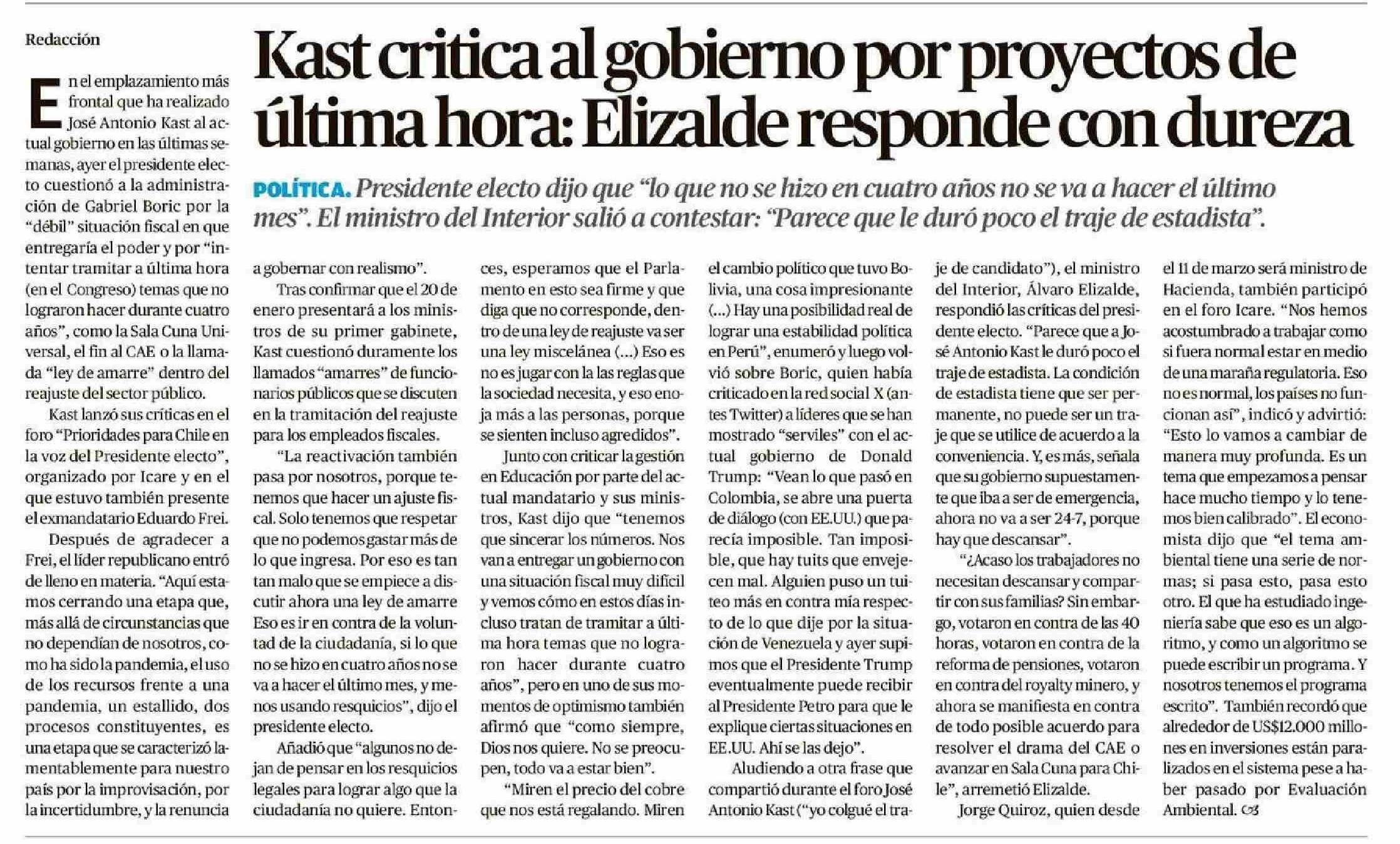 Kast critica al gobierno por proyectos de última hora: Elizalde responde con dureza