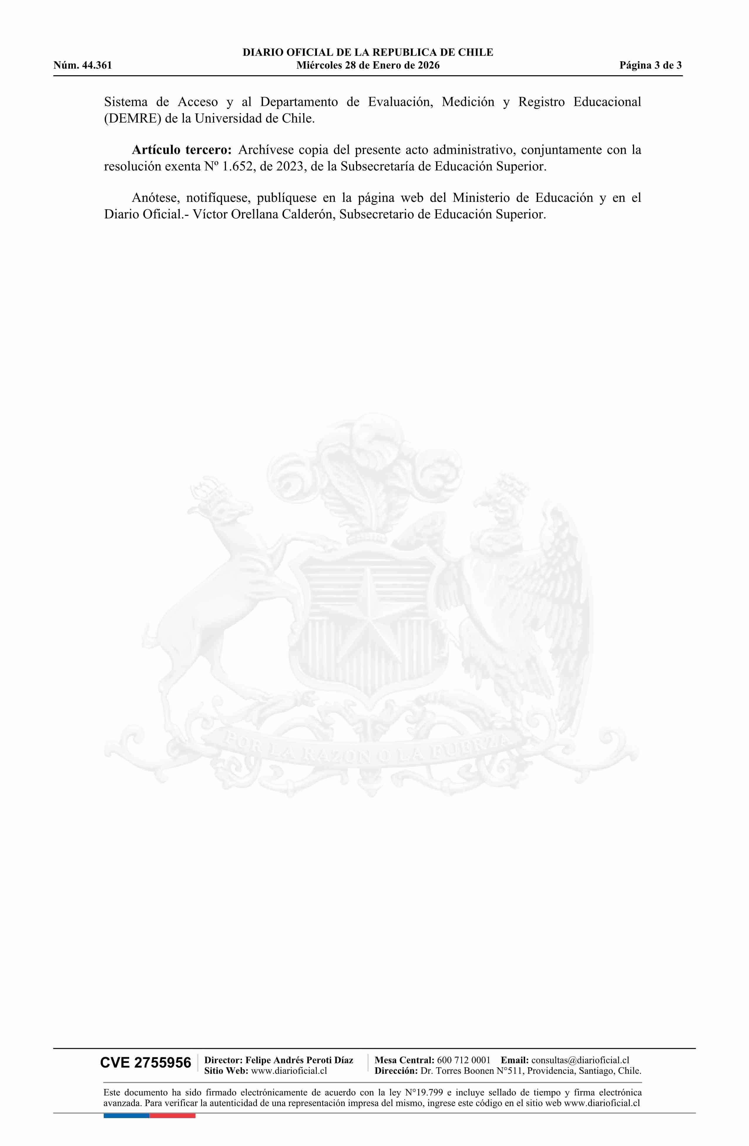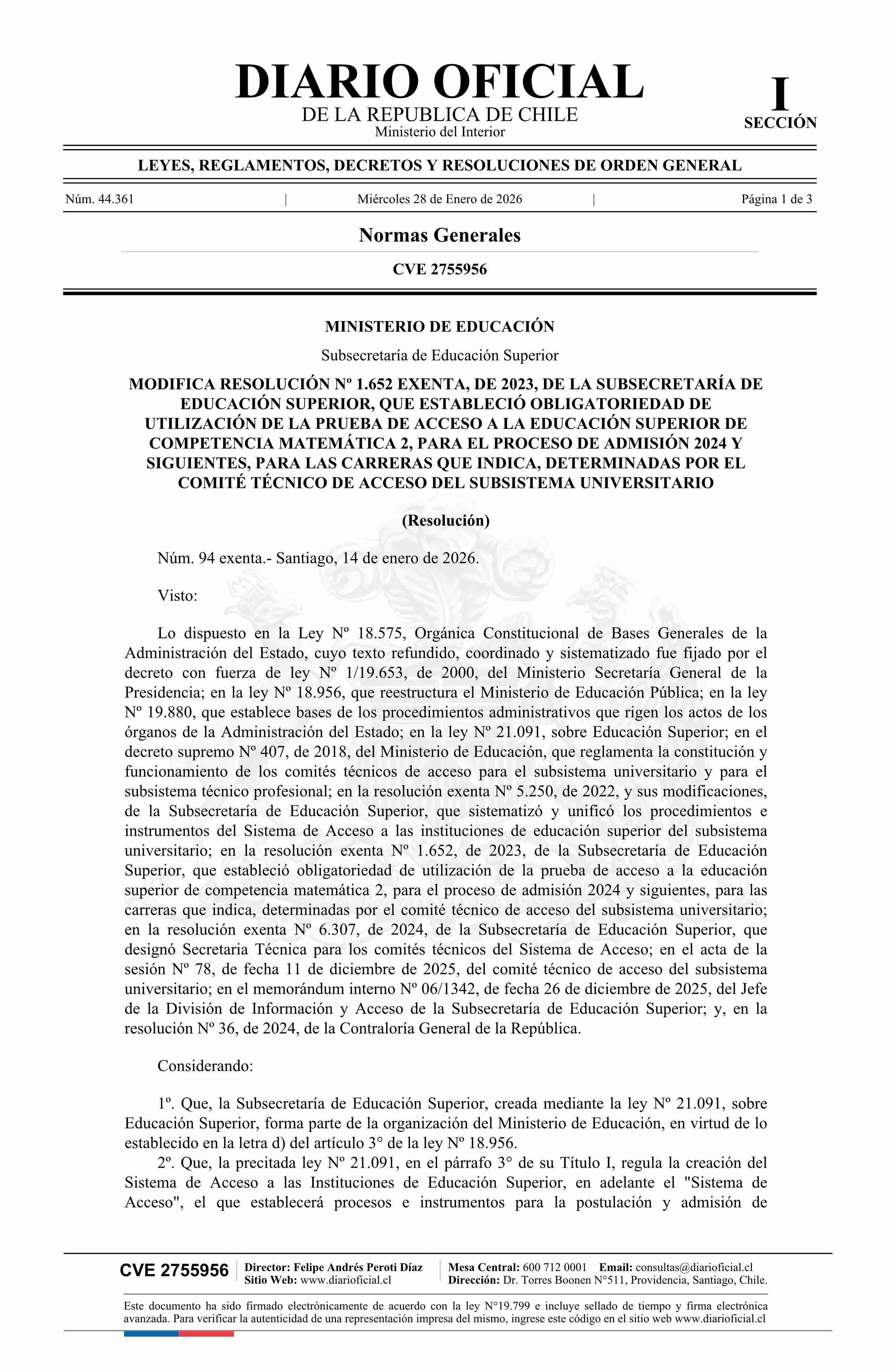| Título: | Resolución exenta número 94, de 2026.- Modifica resolución número 1.652 exenta, de 2023, que estableció obligatoriedad de utilización de la prueba de acceso a la educación superior de Competencia Matemática 2, para el proceso de admisión 2024 y siguientes, para las carreras que indica, determinadas |