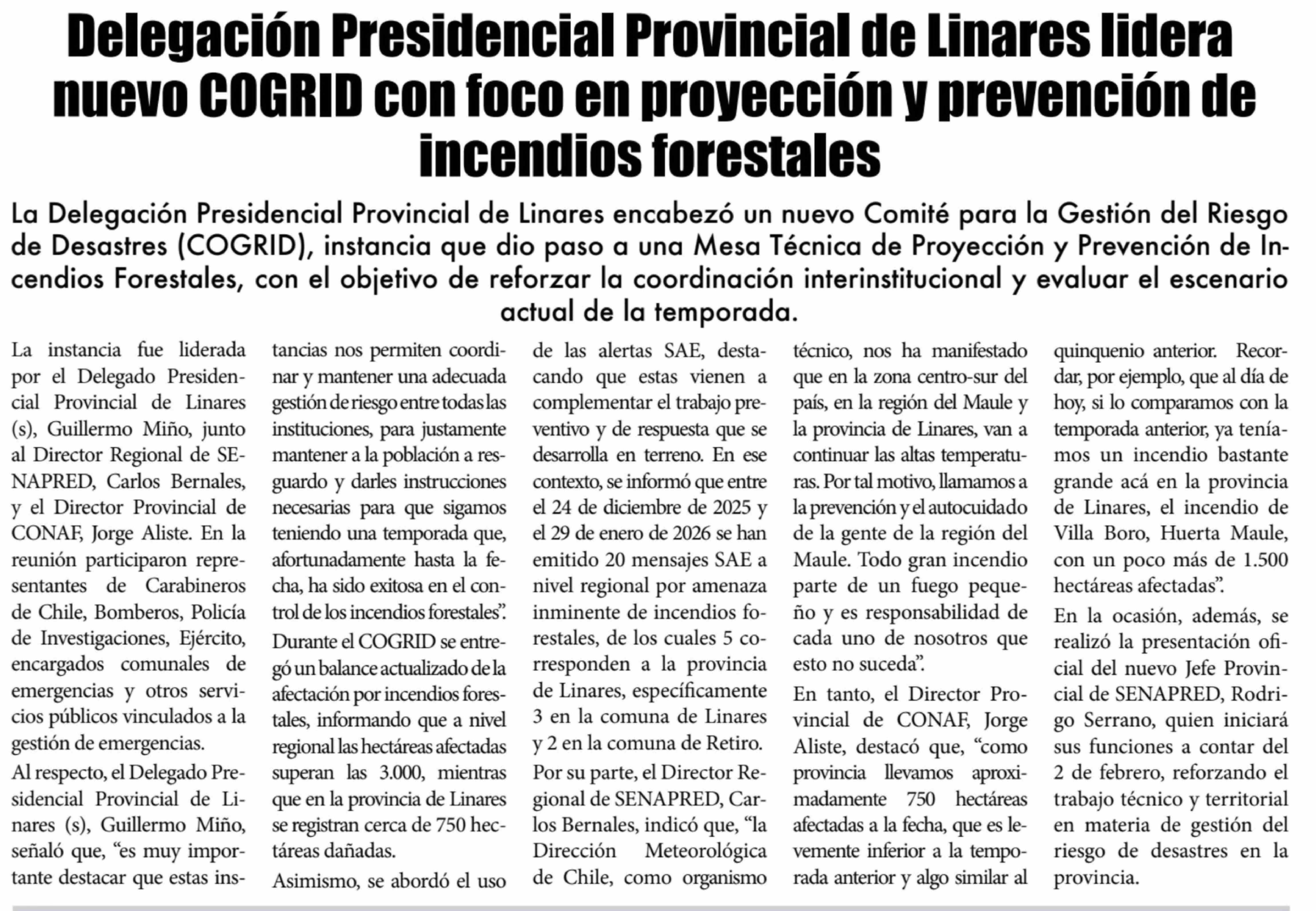 Delegación Presidencial Provincial de Linares lidera nuevo COGRID con foco en proyección y prevención de incendios forestales